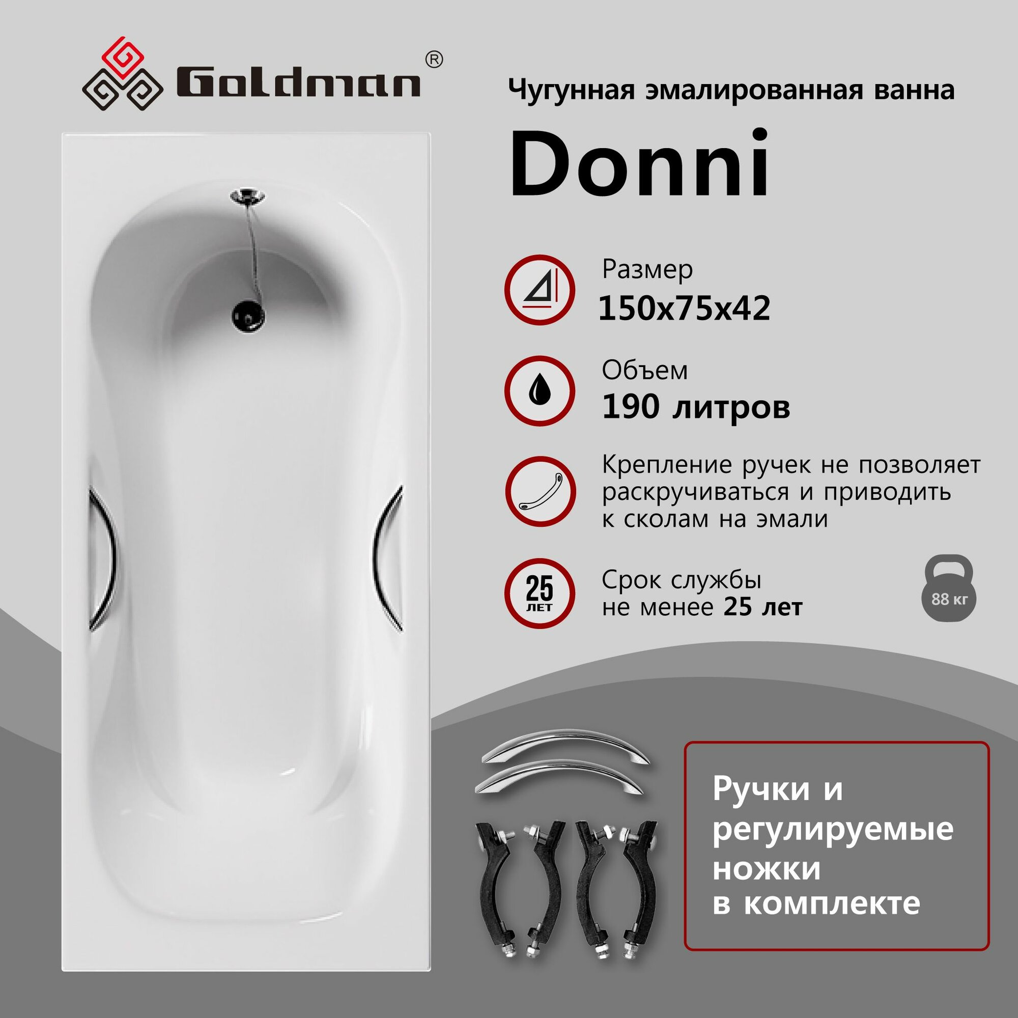 Купить Чугунная ванна Goldman Donni 150x75x42 с дугообразными хромированными ручками