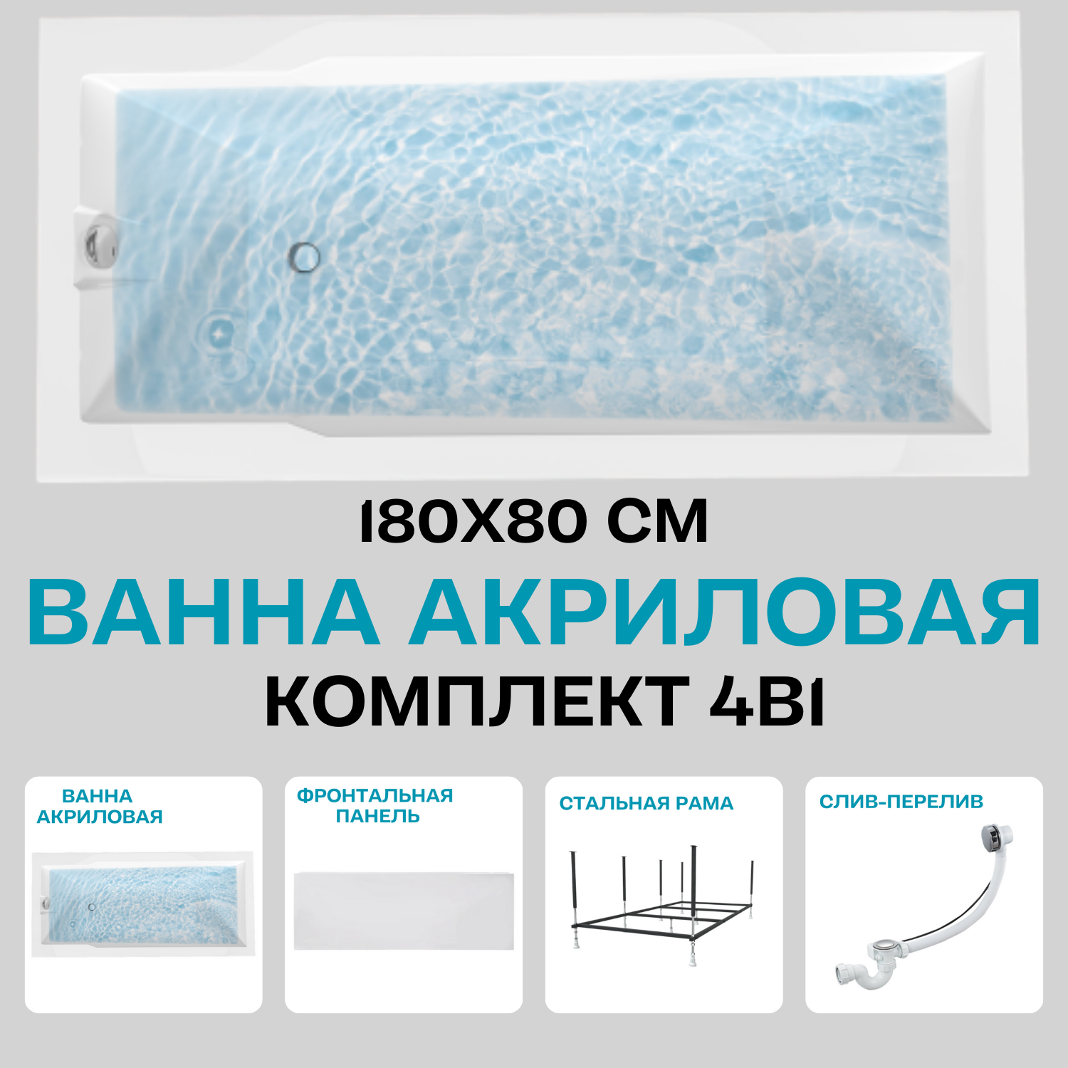 Ванна акриловая 180х80 см RAGUZA комплект 4в1: Прямоугольная ванна, фронтальная панель, каркас, слив-перелив 01ра1880кп интересное: