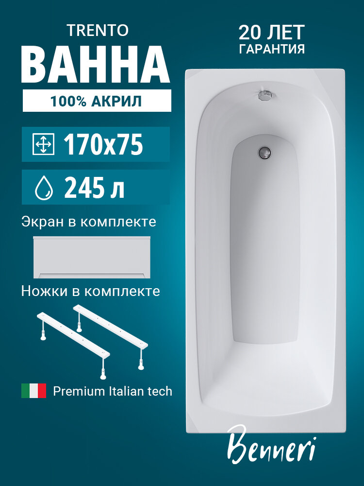 Купить Ванна акриловая прямоугольная Benneri Trento 170x75, с ножками и экраном в комплекте