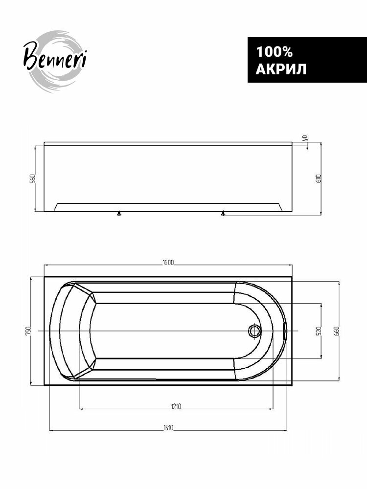 Акриловая ванна прямоугольная Benneri Como 160x70, ножки идут в комплекте