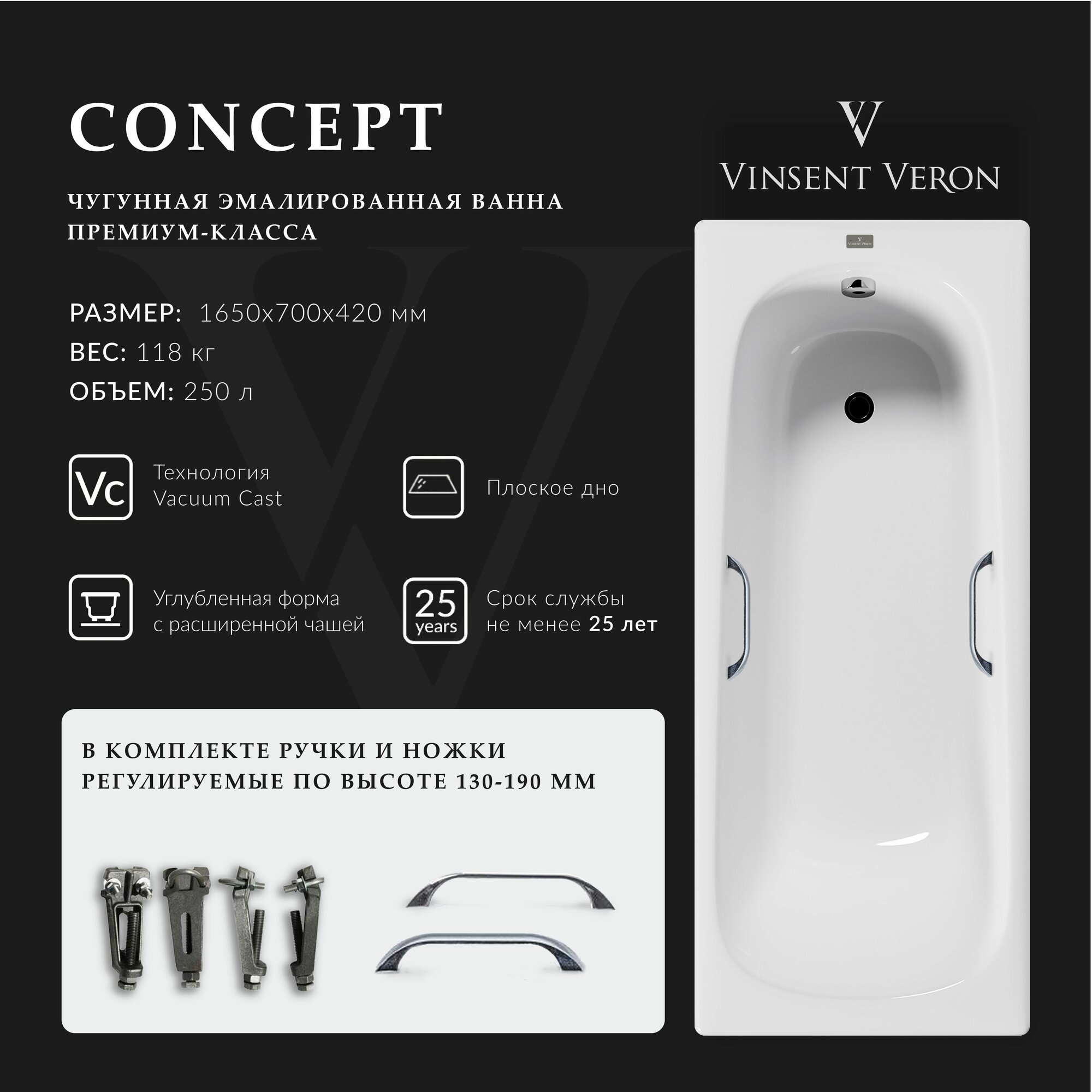 Чугунная ванна Vinsent Veron Concept 165x70x42 с антискользящим покрытием