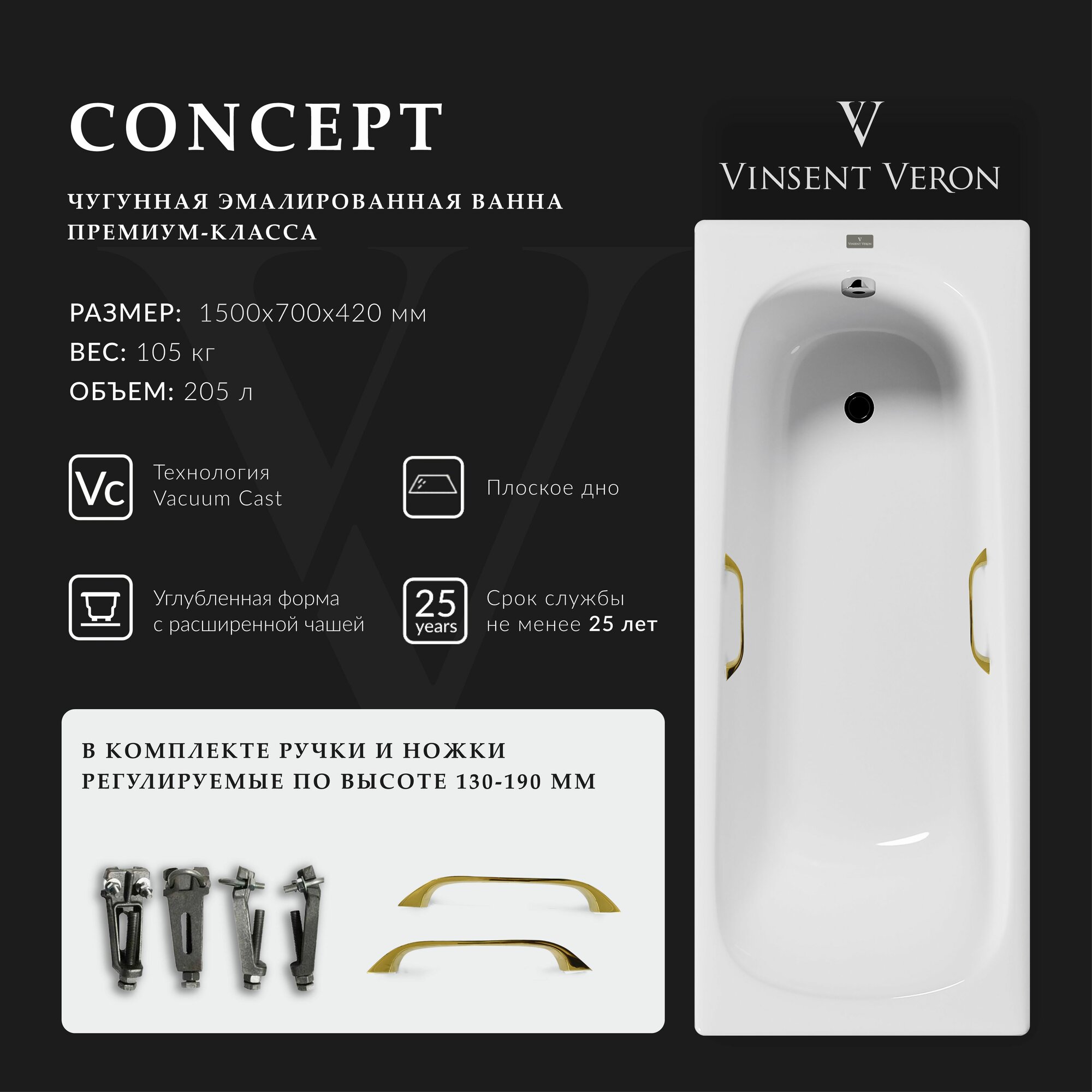 Чугунная ванна Vinsent Veron Concept 150x70x42 с антискользящим покрытием и квадратными бронзовыми ручками