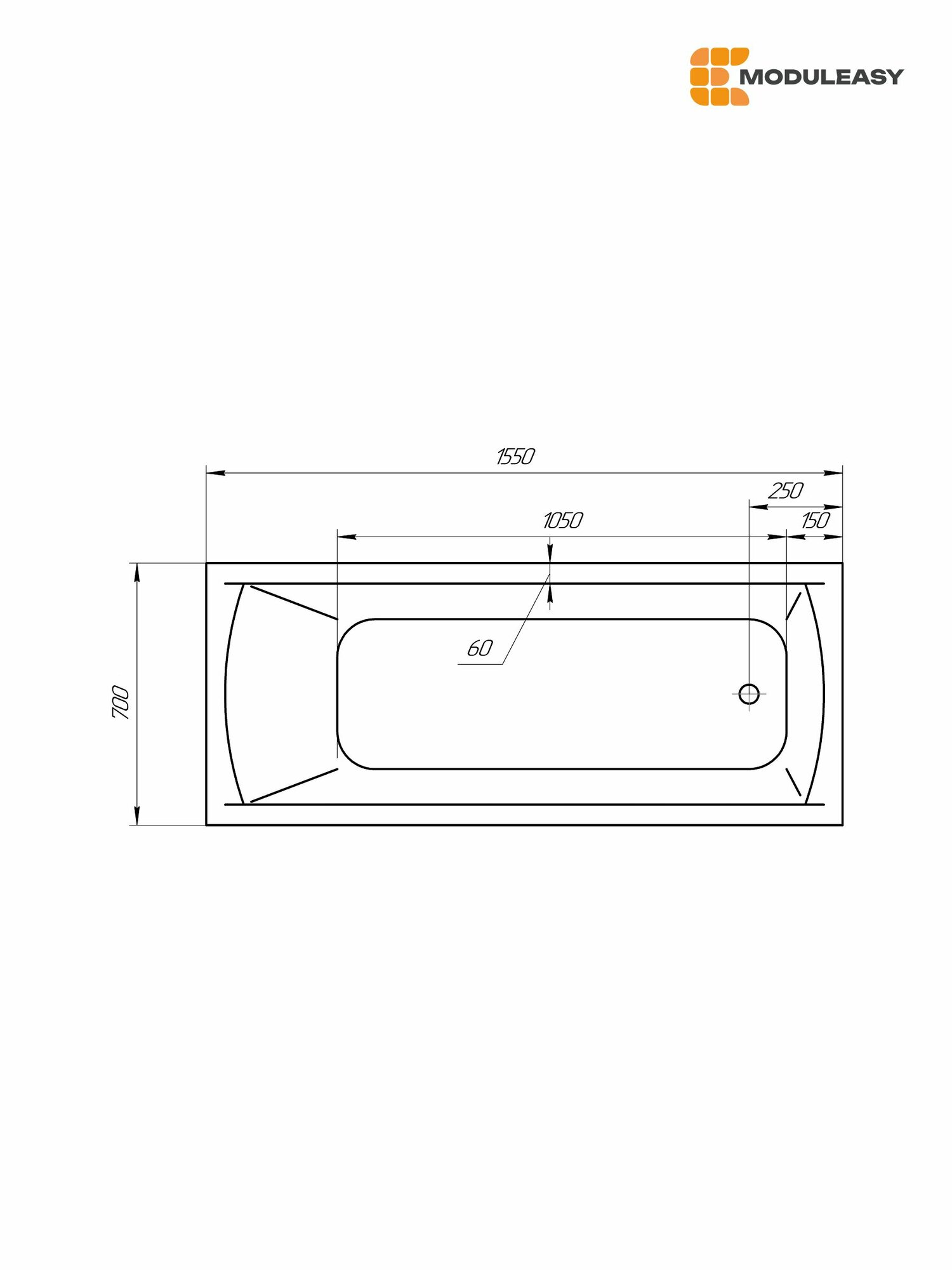 Ванна акриловая 155х70 см KANE Прямоугольная белая, 100% сантехнический акрил, MODULEASY 01кейн15570