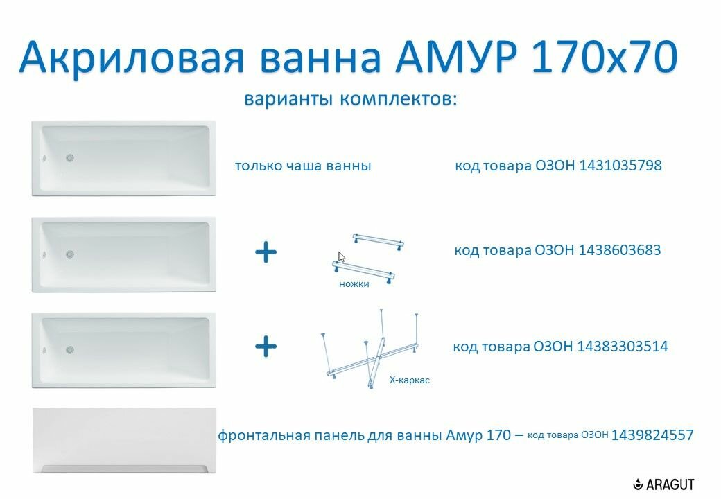Купить Акриловая ванна ARAGUT Амур 170х70 прямоугольная, в комплекте с ножками, белая