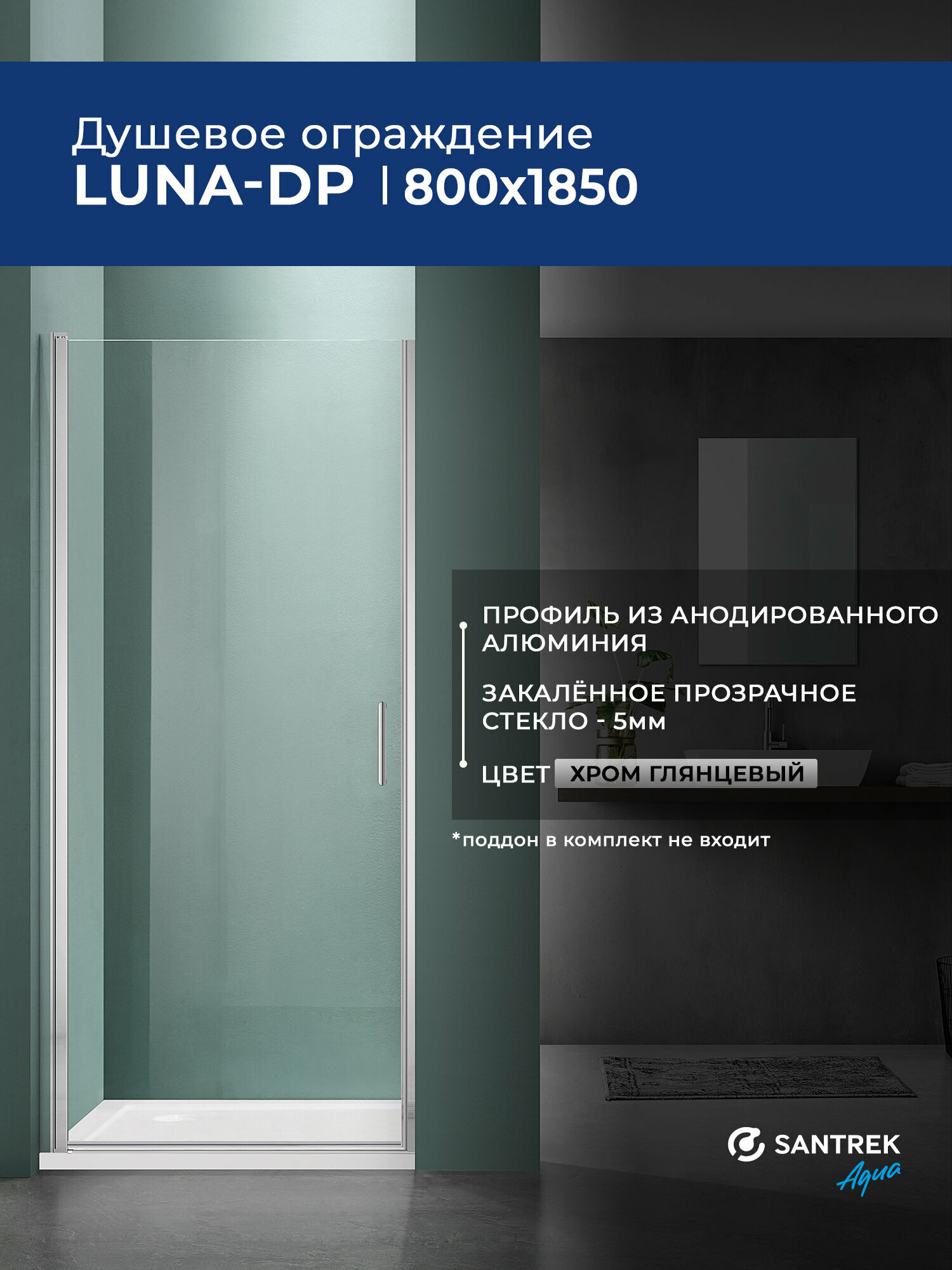 Душевое ограждение дверь в нишу SANTREK Luna- DP- 900-C-Chrome 900*1850 Прямое, стекло Прозр. 5мм, профиль Хром