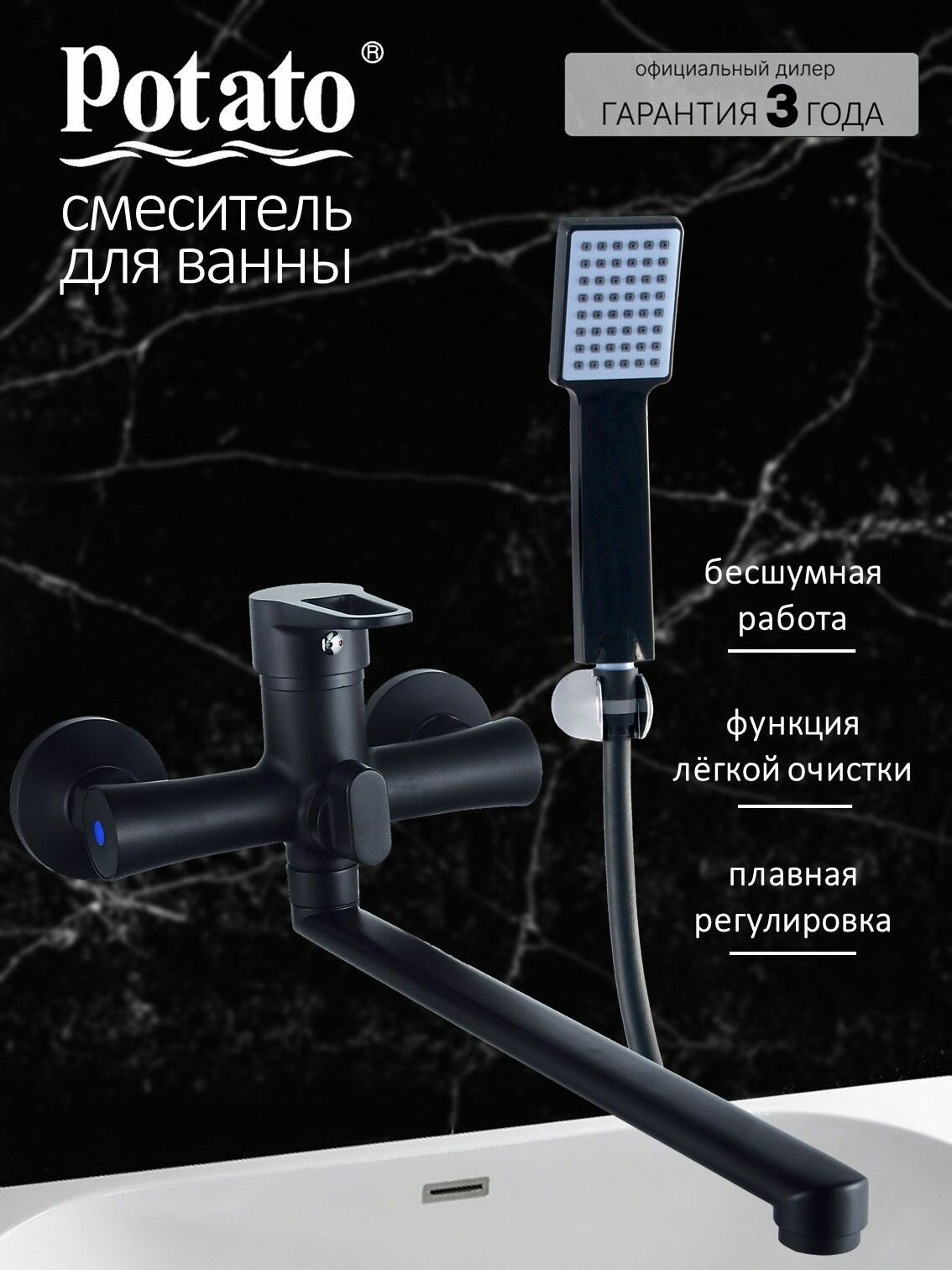 Смеситель для ванны с душем Potato P22270-6 с длинным изливом, кран в ванную, черный интересное: