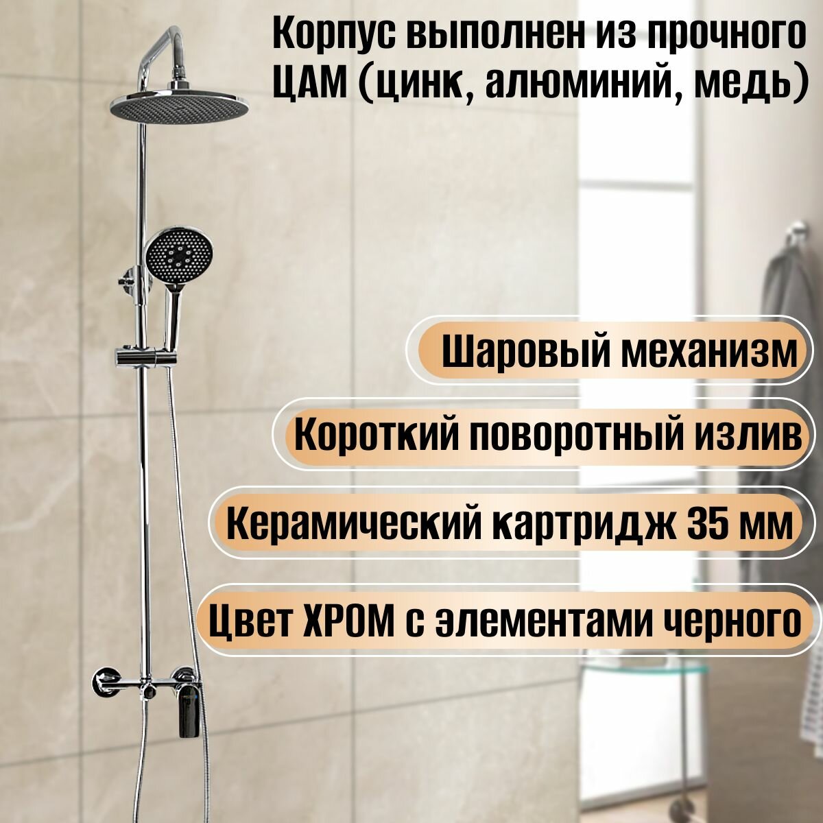 Смеситель + стойка душевая "тропический душ" с двумя круглыми лейками, овальный корпус, цвет хром.