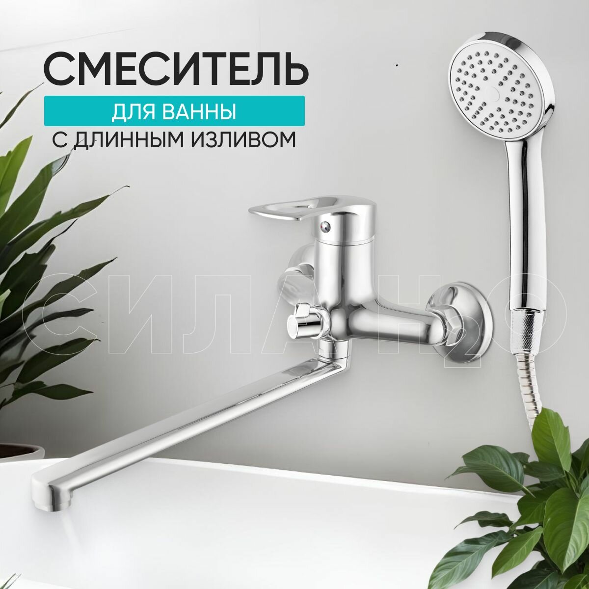 Смеситель для ванны, поворотный, длинный излив 30 см, с душем, хром
