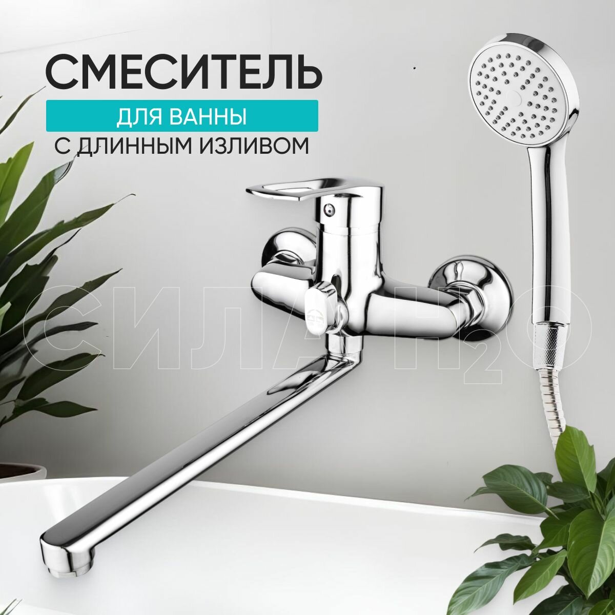 Смеситель для ванны, поворотный, длинный излив 30 см, с душем, хром