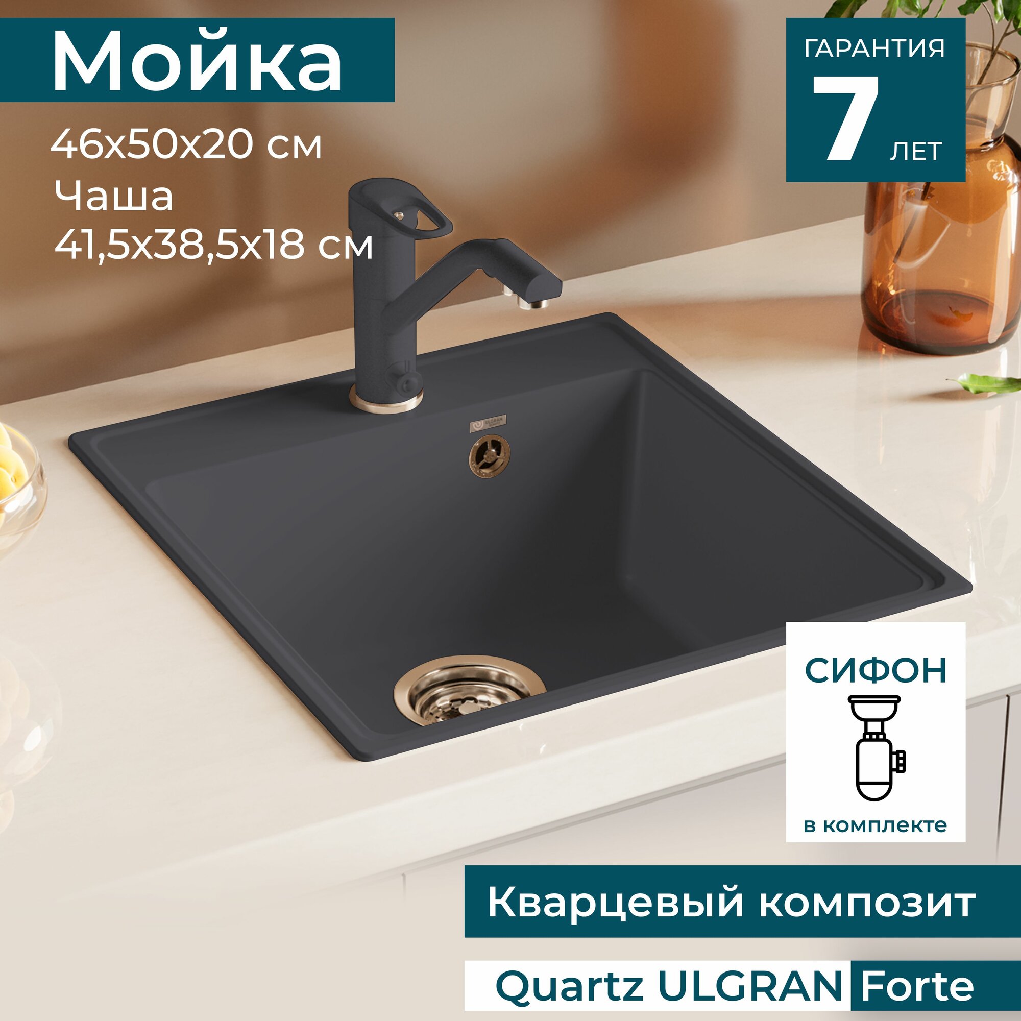 Раковина для кухни врезная каменная ULGRAN Quartz Forte 460 460х500х200 мм / кухонная мойка накладная кварц в комплекте с сифоном, цвет космос интересное: