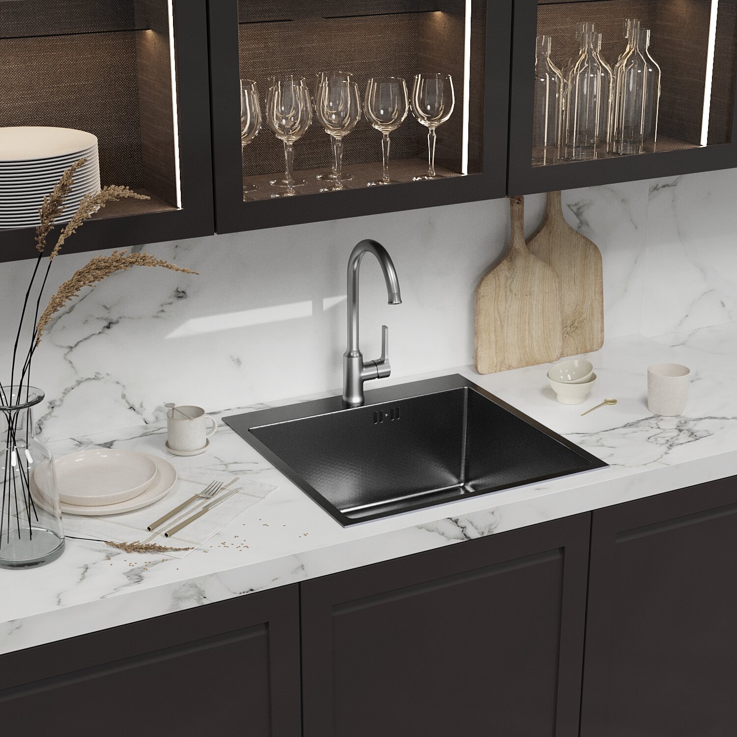Кухонная мойка, нержавеющая сталь, настольная, квадратная, 50x50 см, цвет черный графит, сифон в комплекте,