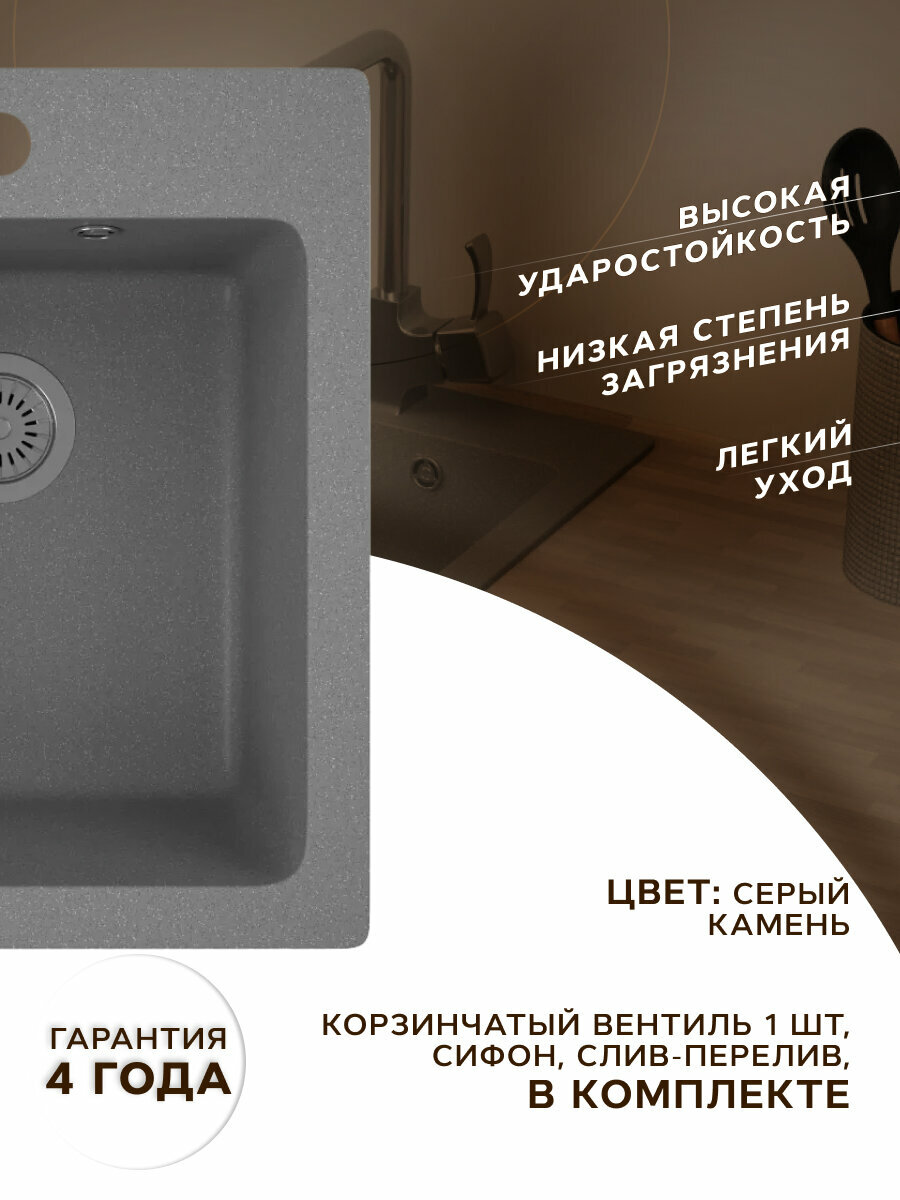 Мойка для кухни BAU Stil Gray stone 56х50, выпуск с сифоном в комплекте, серый камень