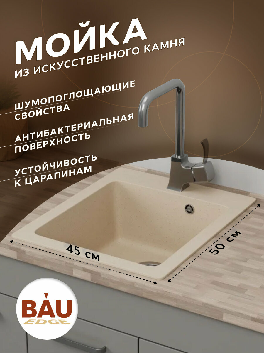 Мойка для кухни BAU Stil Sand 42х50, выпуск с сифоном в комплекте, бежевый песок