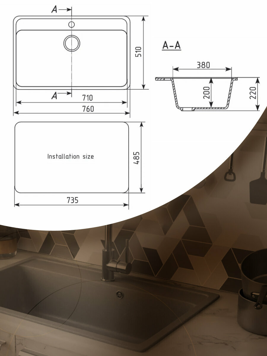 Мойка для кухни BAU Stil Black stone 76х51, выпуск с сифоном в комплекте, черный камень