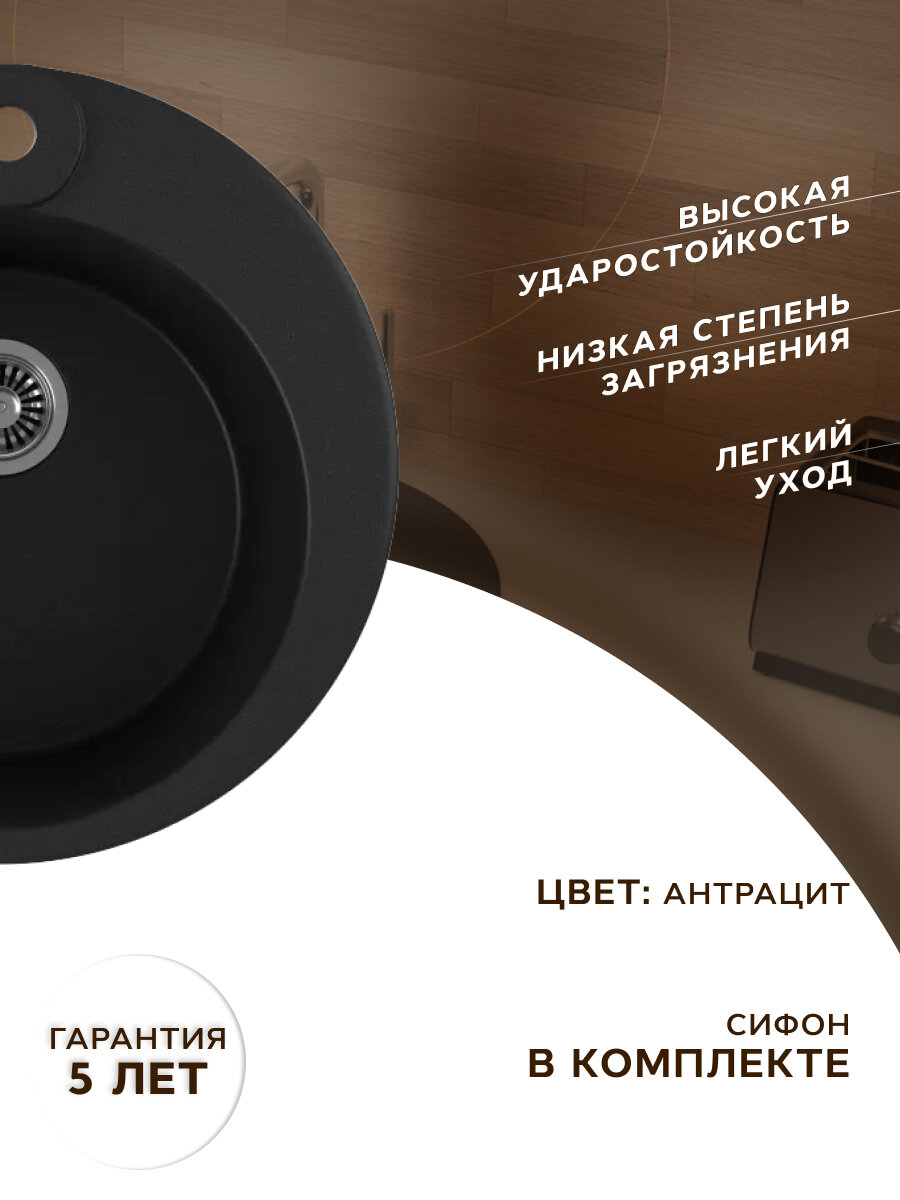 Купить Мойка для кухни врезная кварцевая в комплекте с сифоном BAU Dream Anthracite 51, антрацит