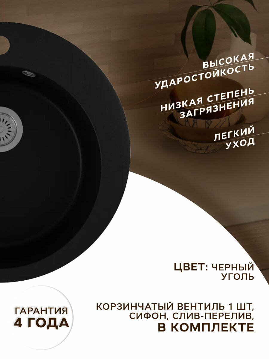Мойка для кухни BAU Dream Black coal D 51, выпуск с сифоном в комплекте, черный уголь
