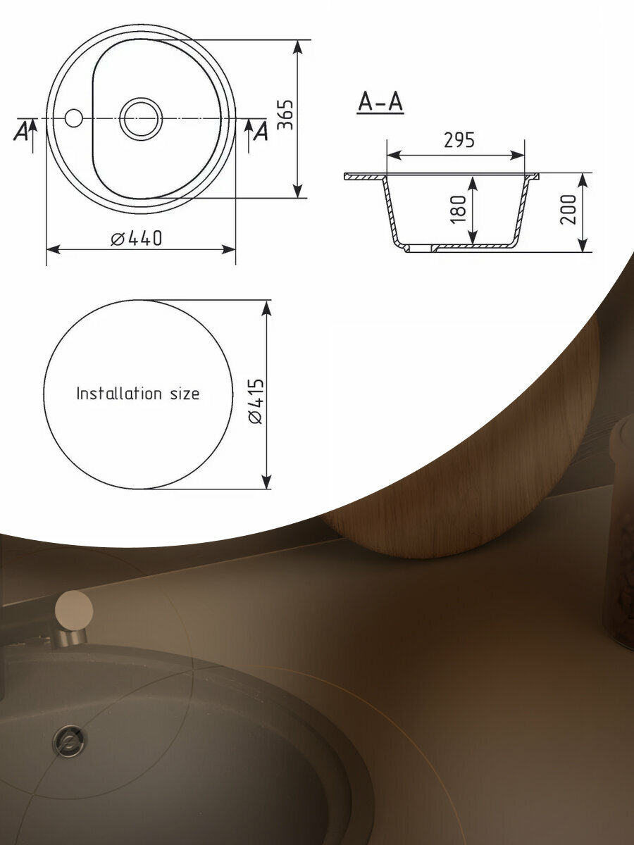 Мойка для кухни BAU Dream Black stone D 44, выпуск с сифоном в комплекте, черный камень