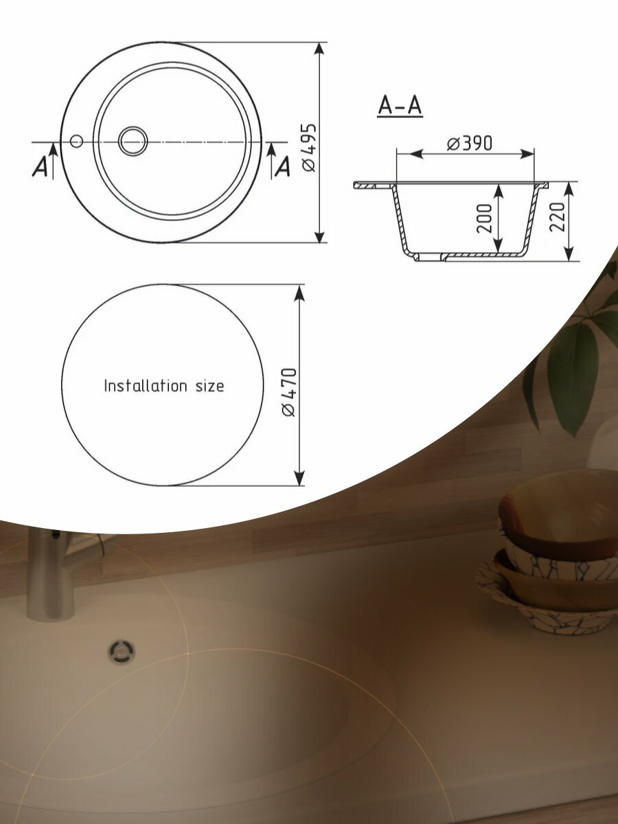 Мойка для кухни BAU Dream Black stone D 50, выпуск с сифоном в комплекте, черный камень