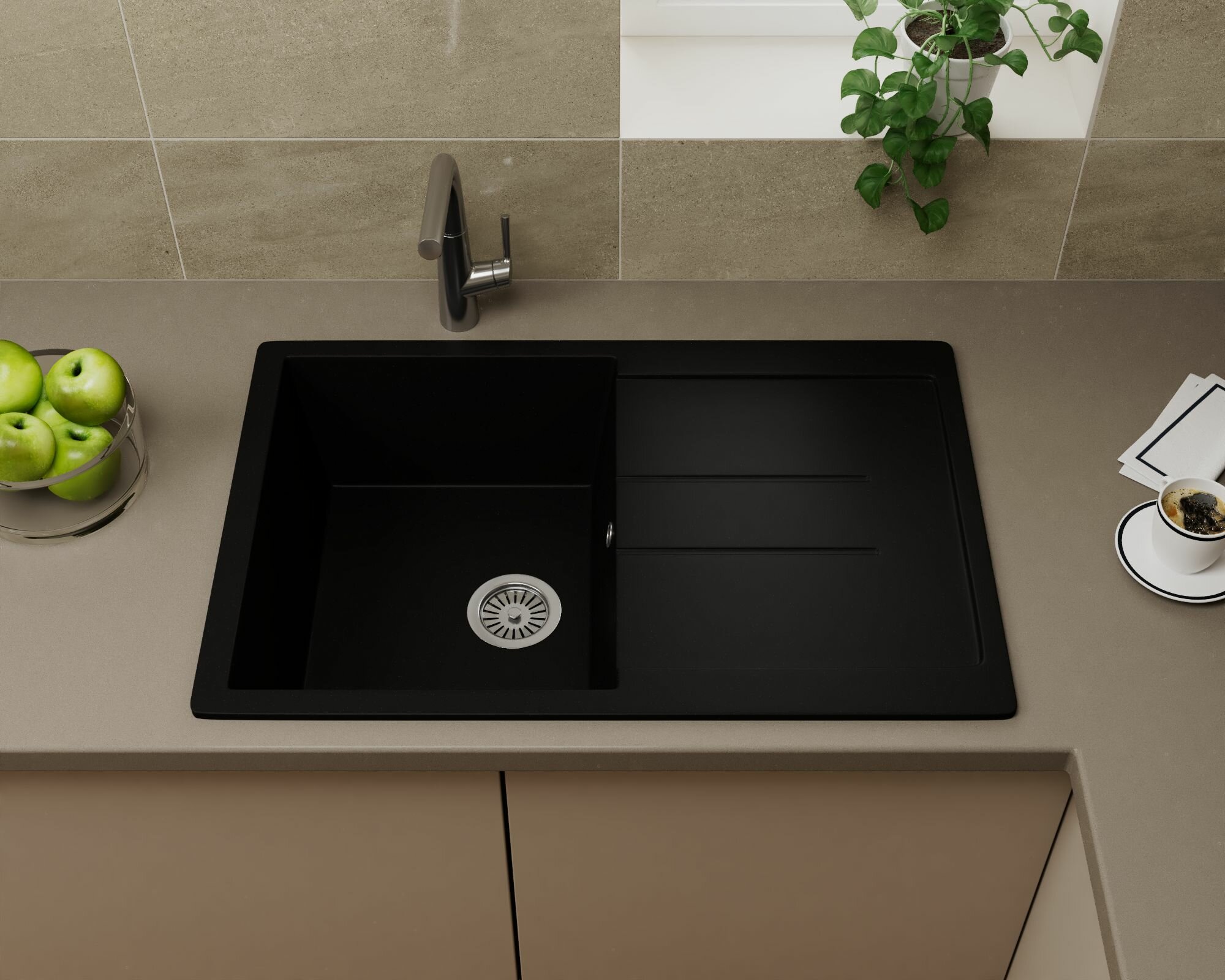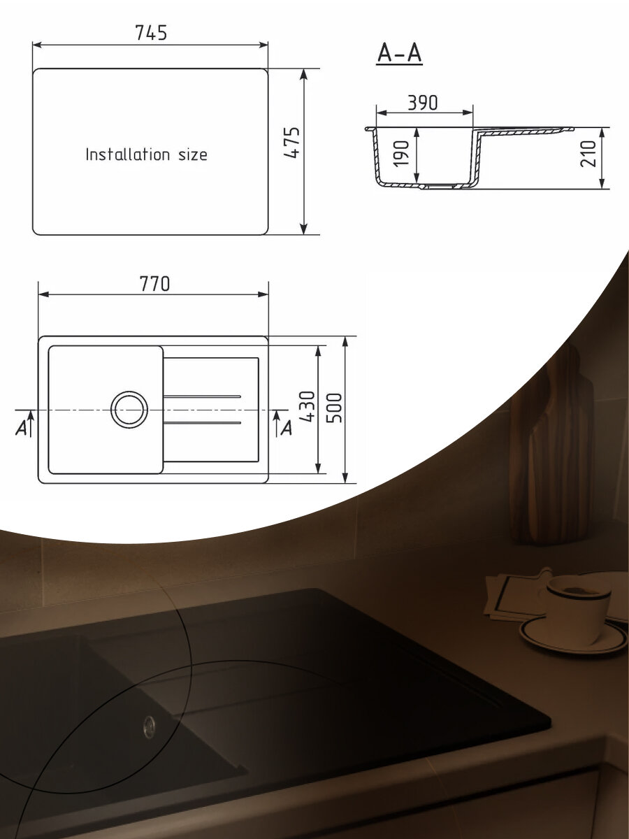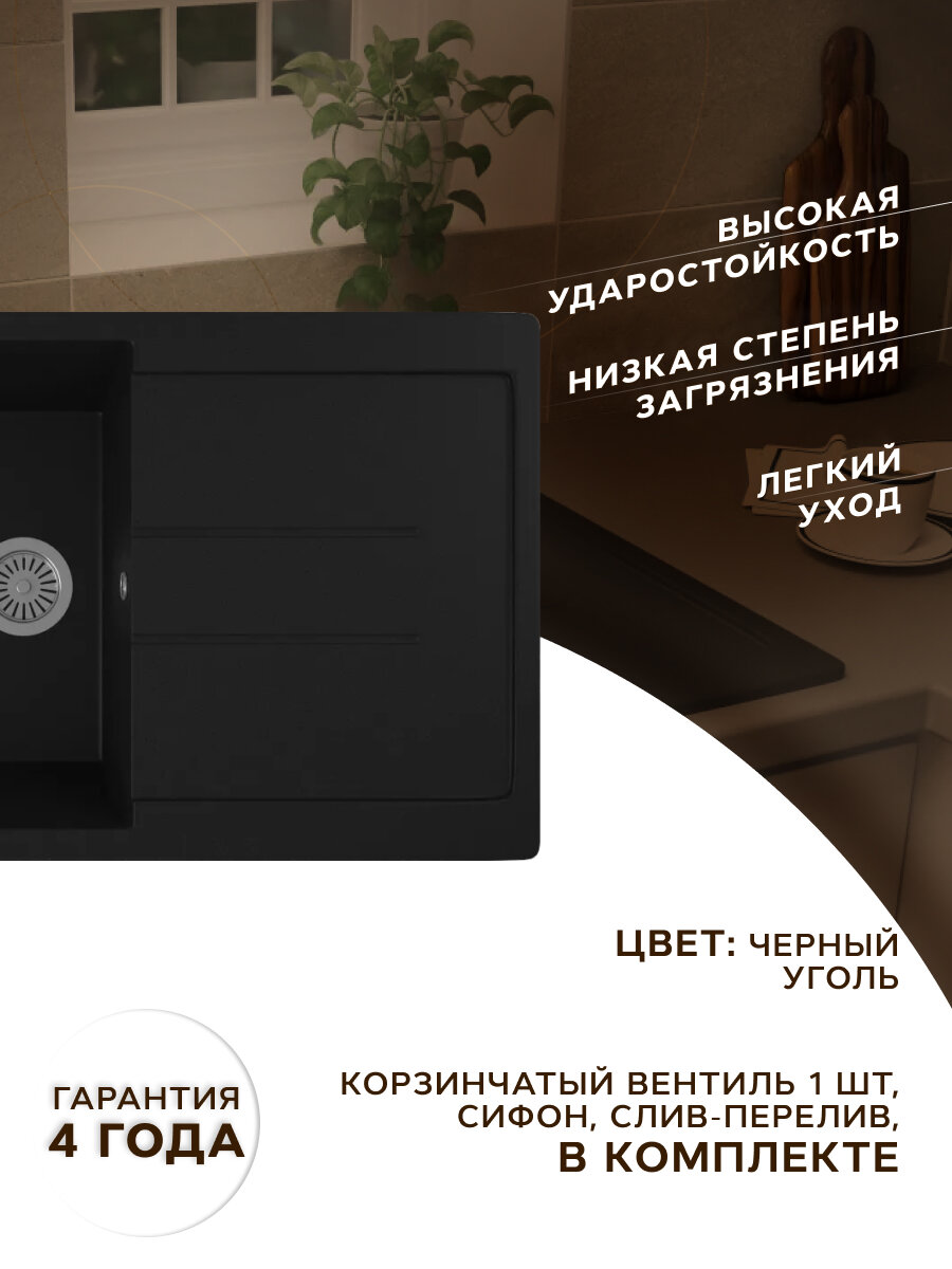 Мойка для кухни оборачиваемая с крылом BAU Stil Black coal 77х50, выпуск с сифоном в комплекте, черный уголь интересное: