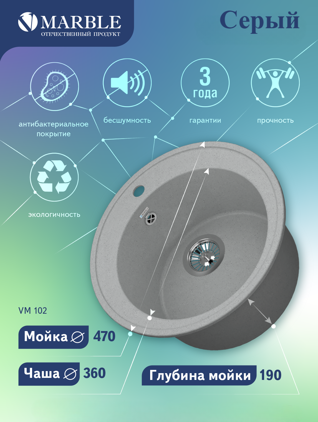 Кухонная мойка MARBLE VM102 серый искусственный мрамор, круглая интересное: