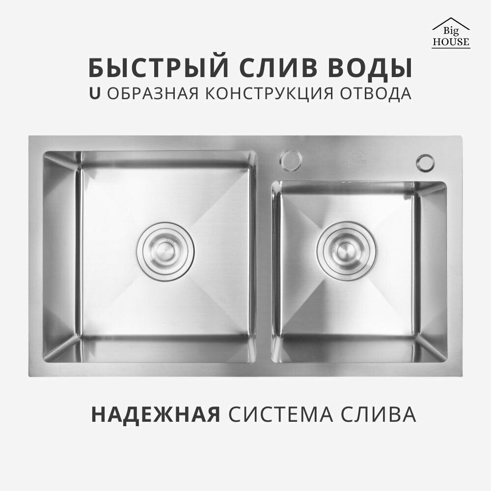 Мойка врезная Big House Двойная 72х40 см, толщина 3,0х0,8 мм, глубина 215 мм, сифон с переливом интересное: