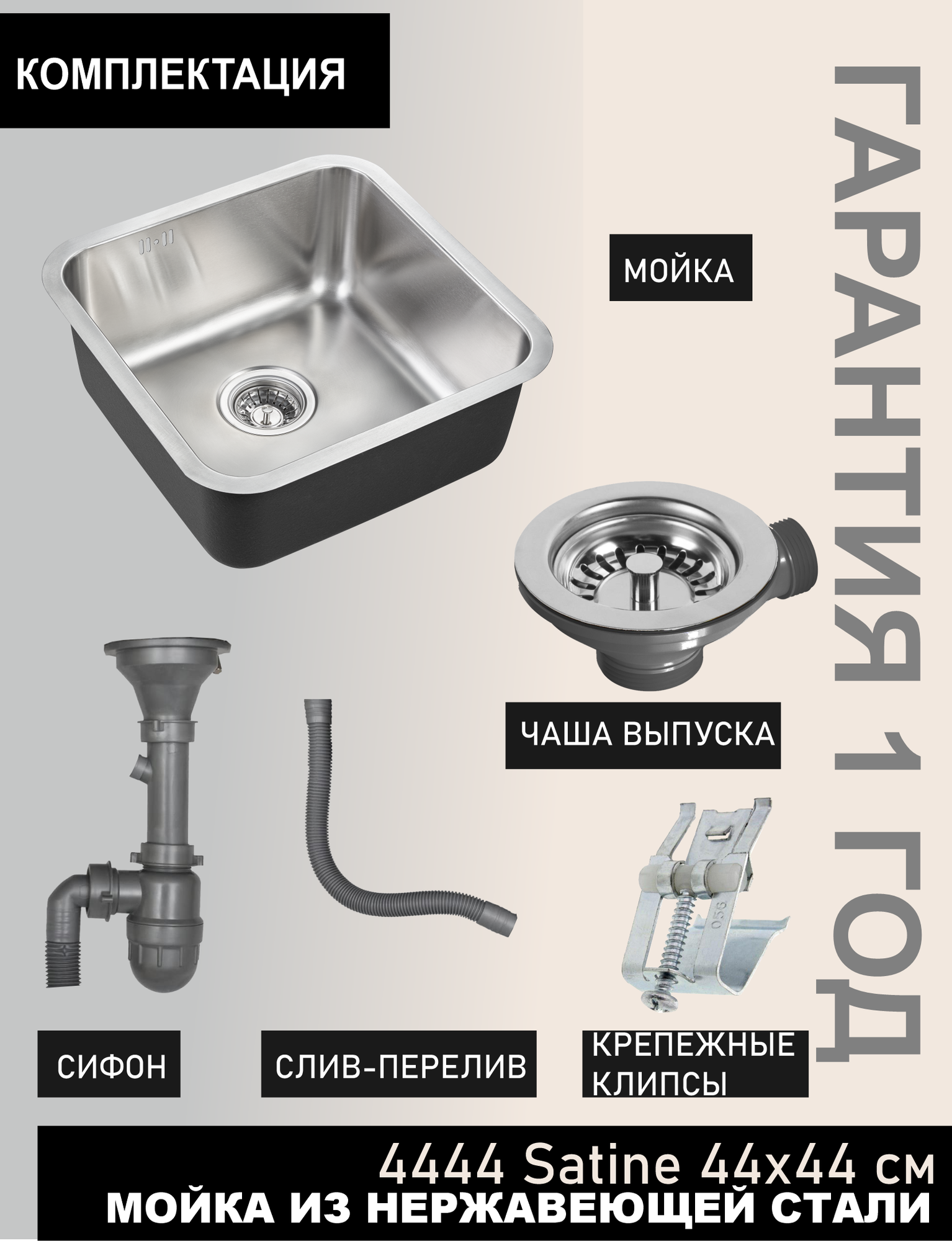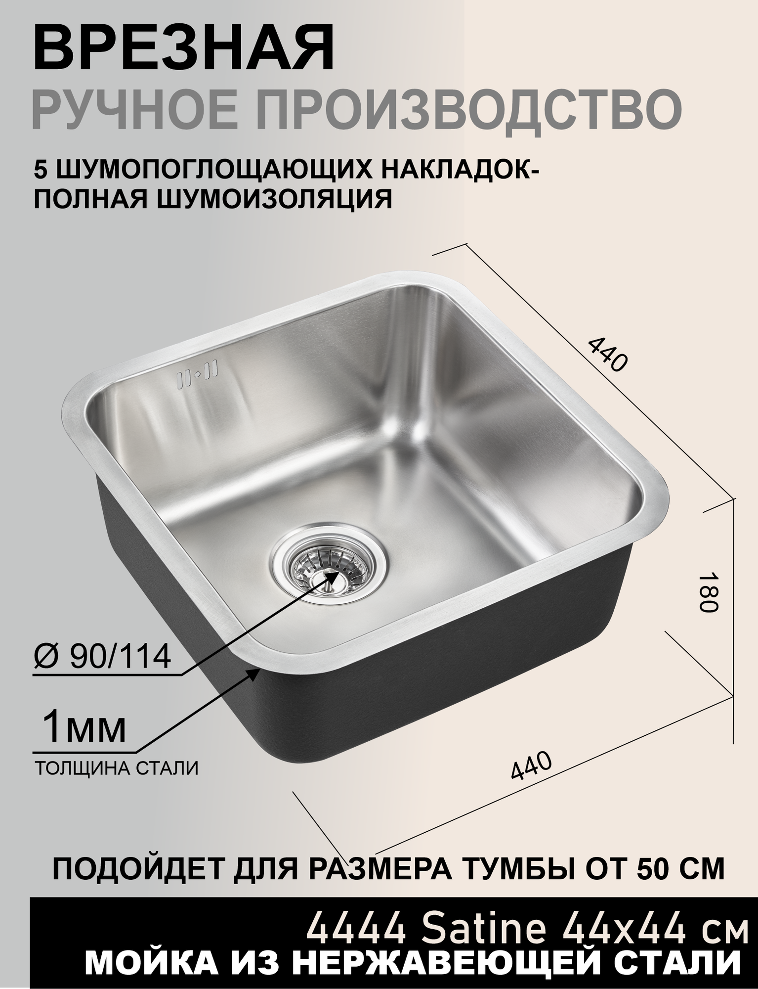 Купить Мойка для кухни врезная 44х44 см сатин под столешницу. В комплекте сифон, арматура, перелив