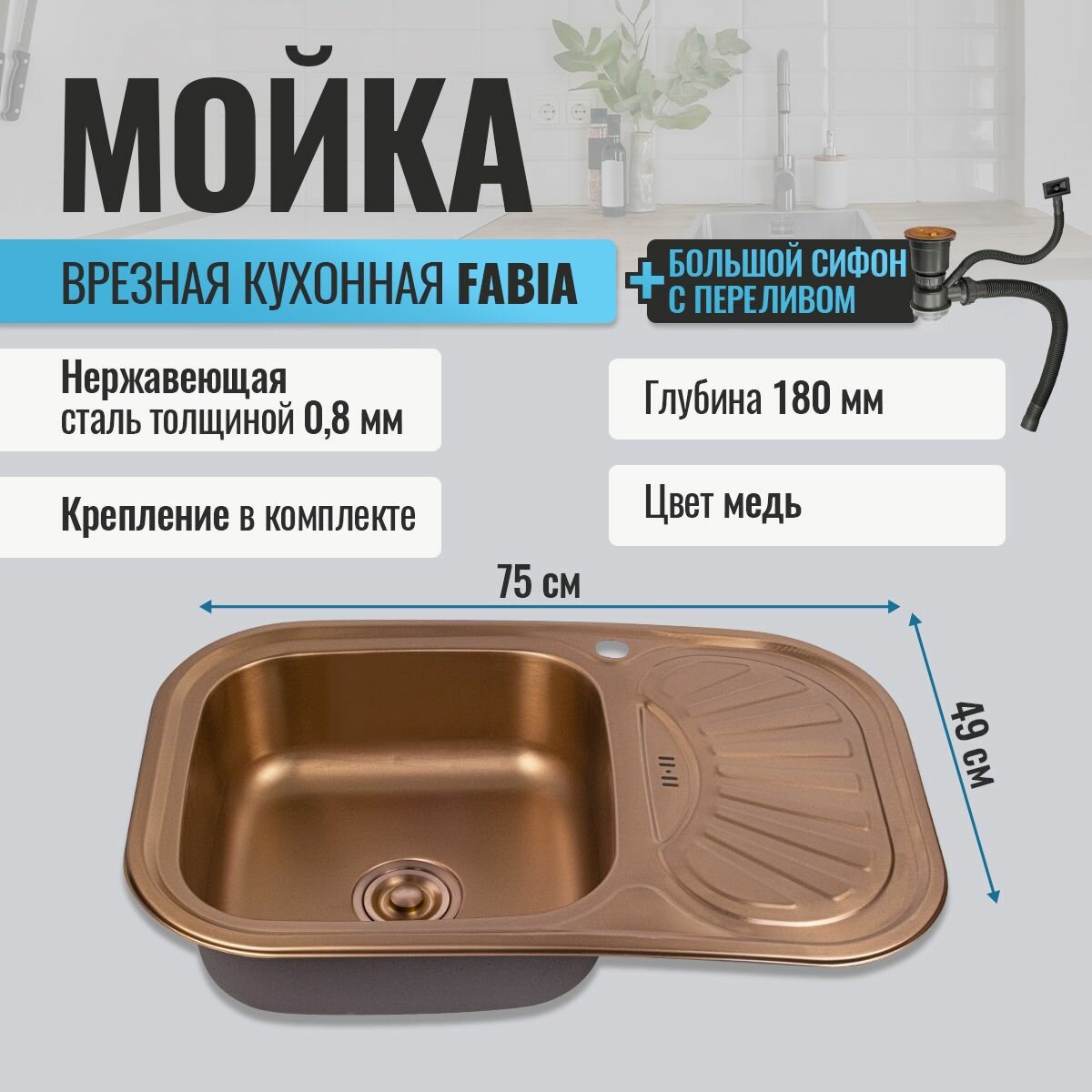 Мойка кухонная FABIA врезная, 75х49, глубина 180 мм, большой сифон с переливом интересное:
