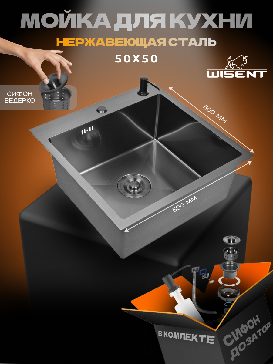 Купить Мойка для кухни Wisent 50*50 из нержавеющей стали, с дозатором и сифоном ведерко WGS35050B графит