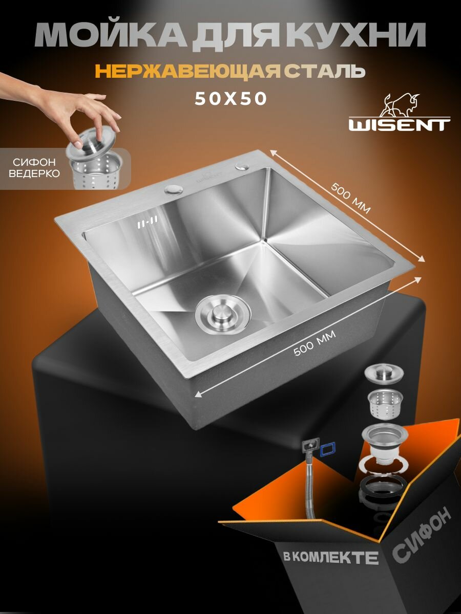 Мойка для кухни Wisent 50*50 из нержавеющей стали, с дозатором и сифоном ведерко WGS35050 сатин