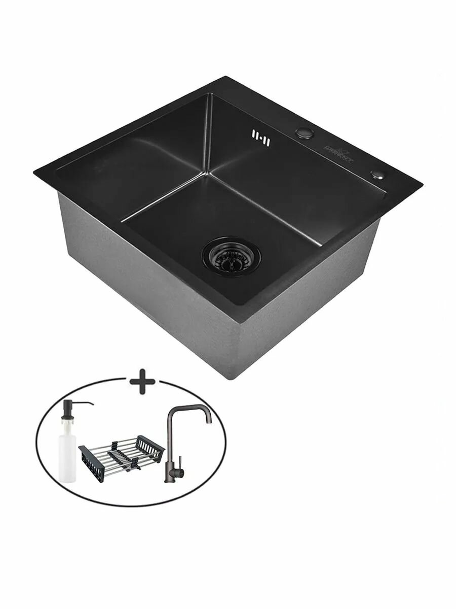 Купить Мойка для кухни нержавеющая врезная 50*50 WISENT графит со смесителем, коландером и дозатором