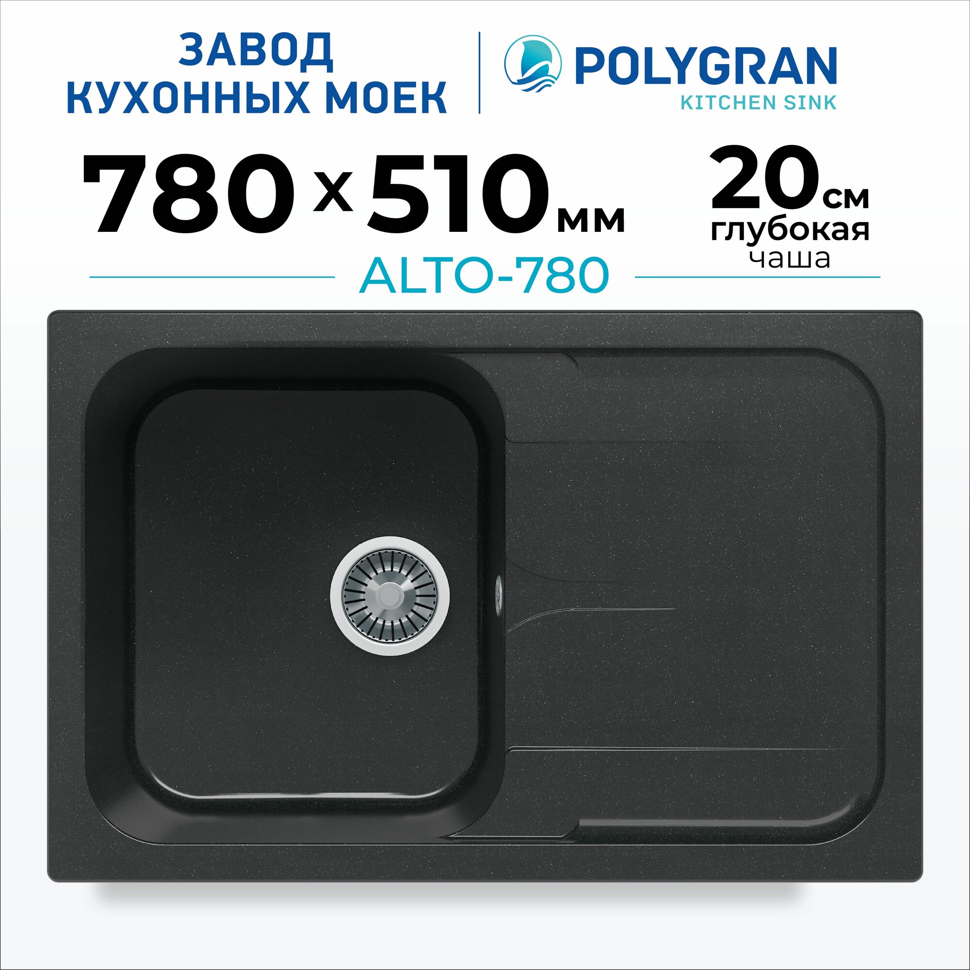 Купить Мойка для кухни каменная POLYGRAN ALTO-780, Черная, Врезная, Квадратная, С крылом (Космос)