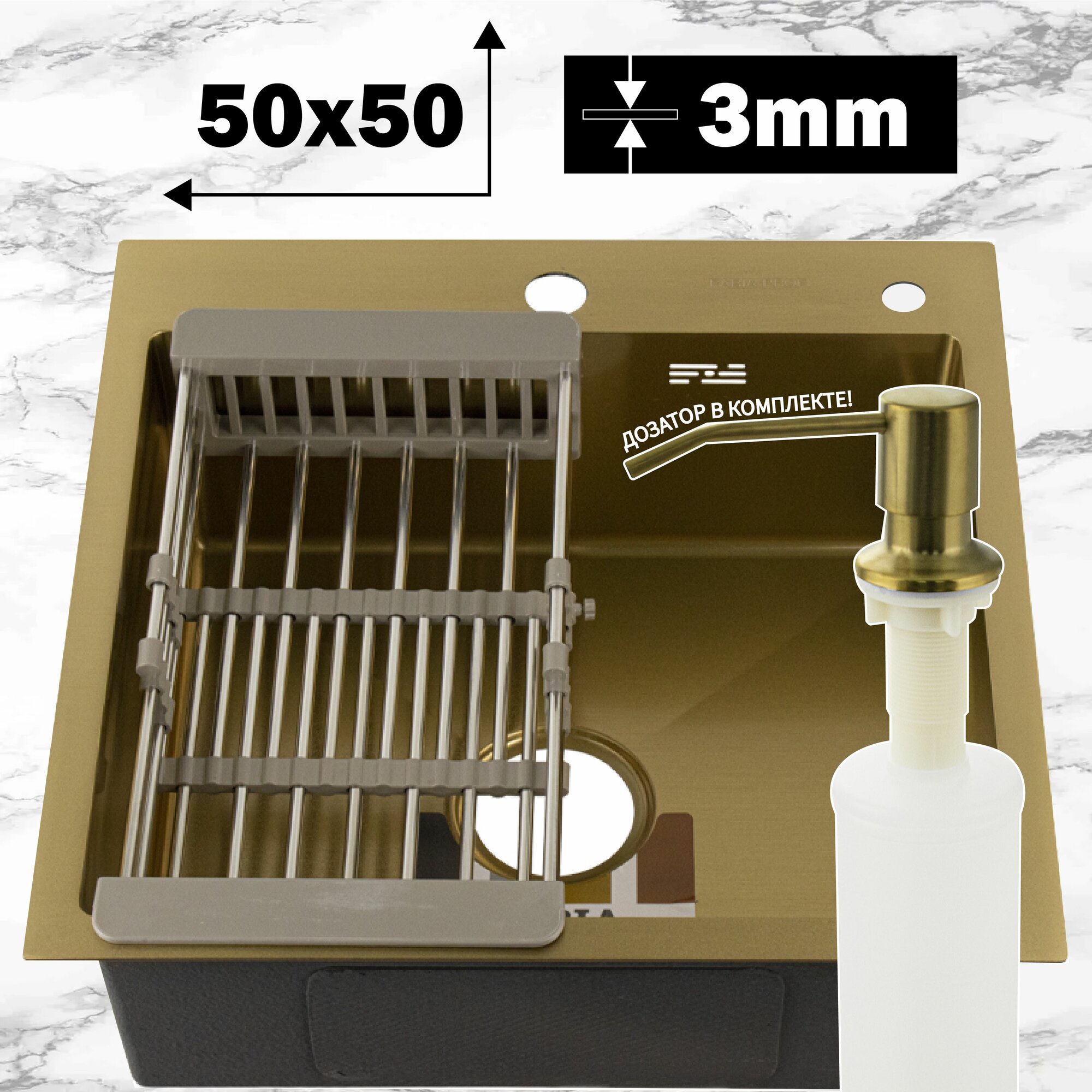 Мойка для кухни нержавеющая FABIA Profi 50503Z золото врезная 50х50 см с дозатором интересное: