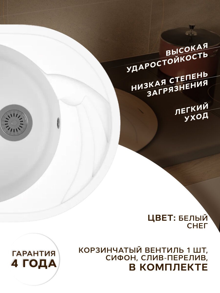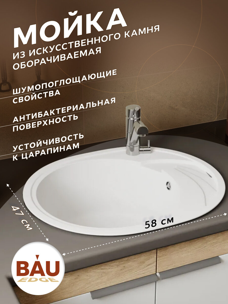 Мойка для кухни оборачиваемая овальная BAU Nimb White snow 58х47, выпуск с сифоном в комплекте, белый снег интересное: