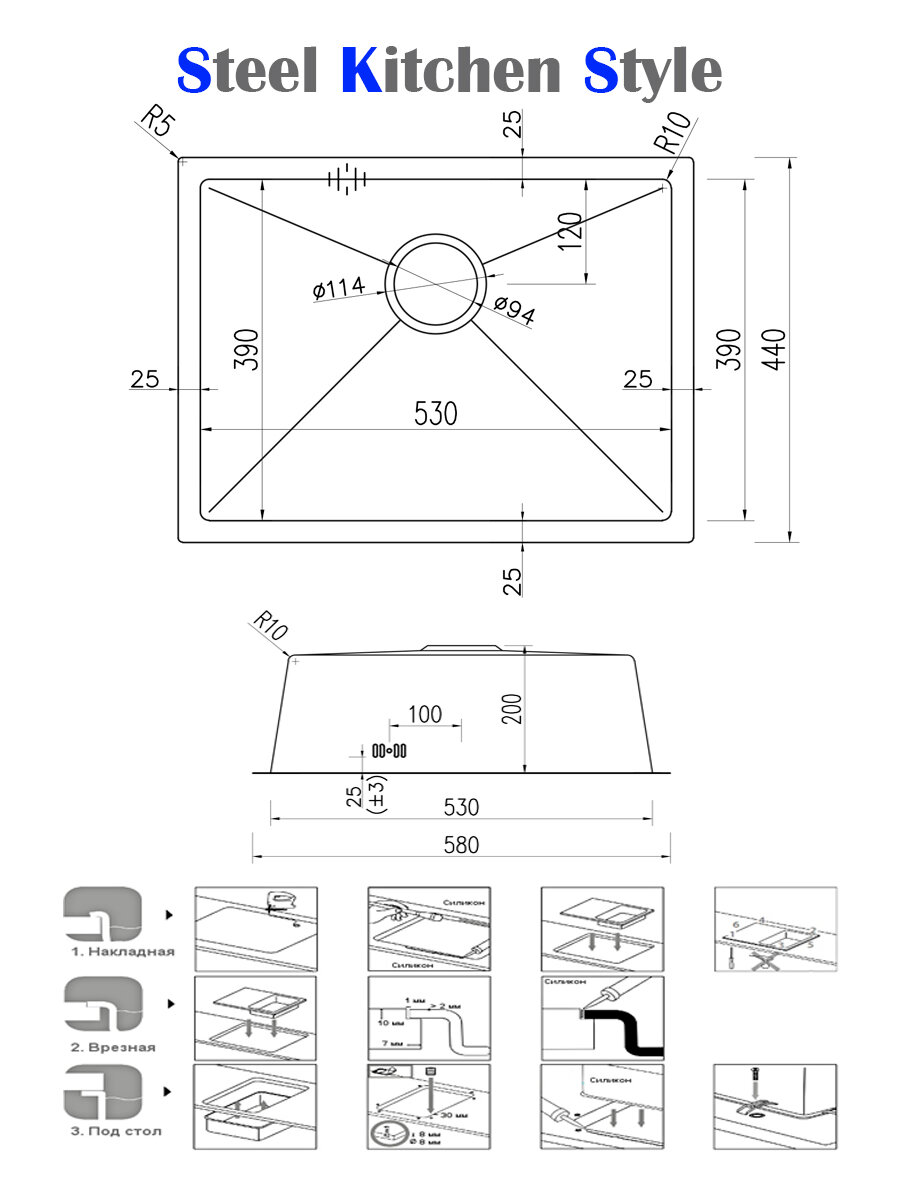 Кухонная мойка Steel Kitchen Style из нержавеющей стали, сварная высокопрочная, 58х44 см, полный комплект