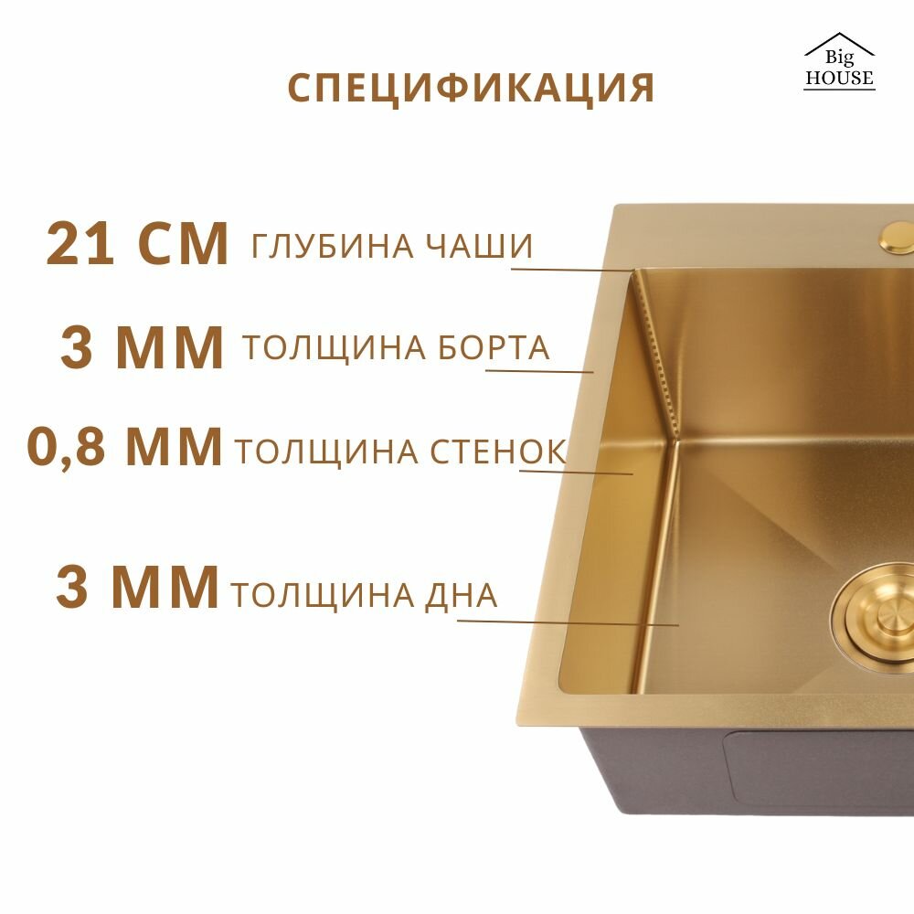 Мойка врезная Big House 72х40 см, толщина 3,0х0,8 мм, глубина 215 мм, цвет Золото, сифон с переливом интересное: