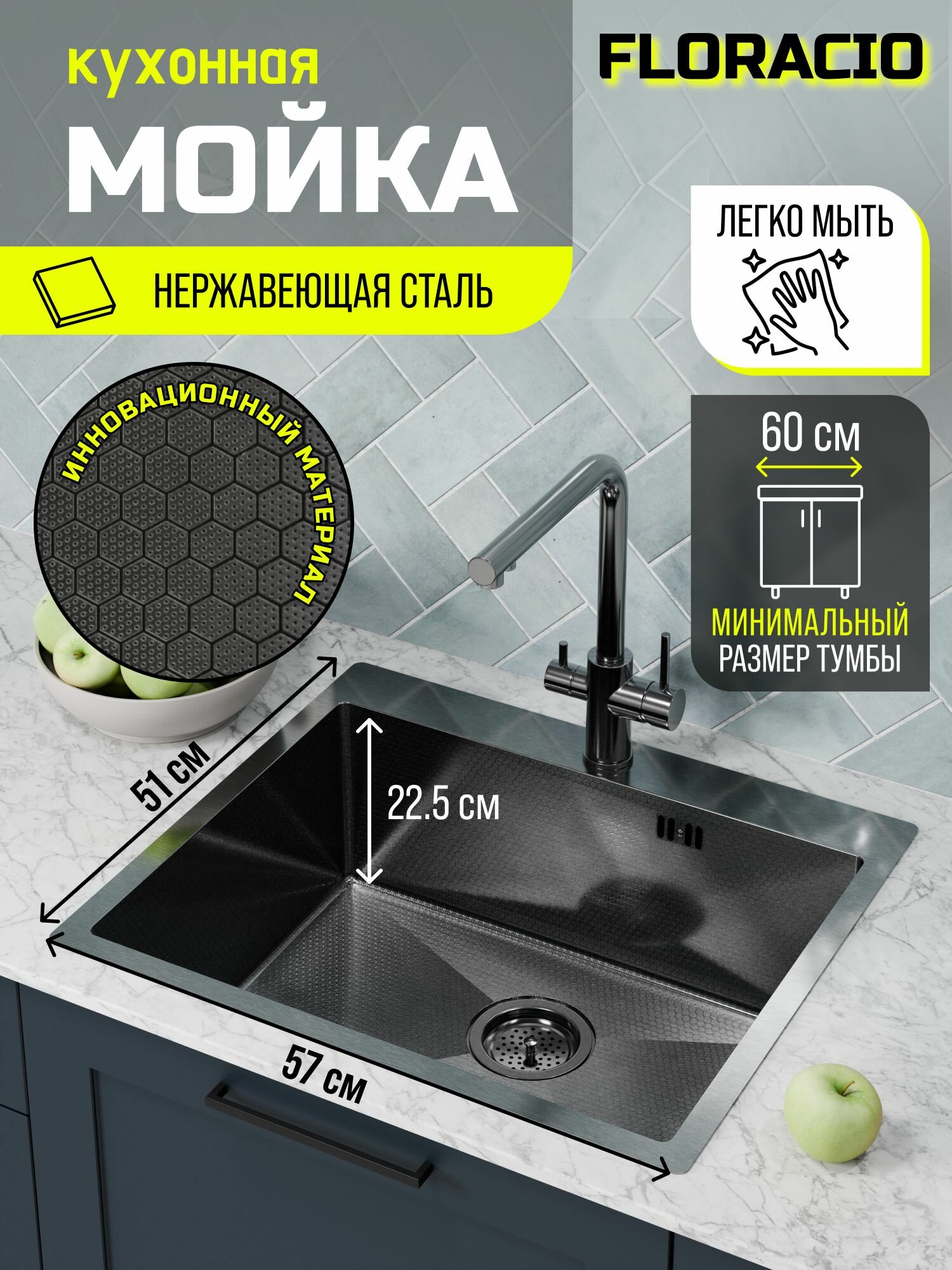 Кухонная мойка FLORACIO Steel F.5751. GMD (DECOR), вороненая сталь интересное: