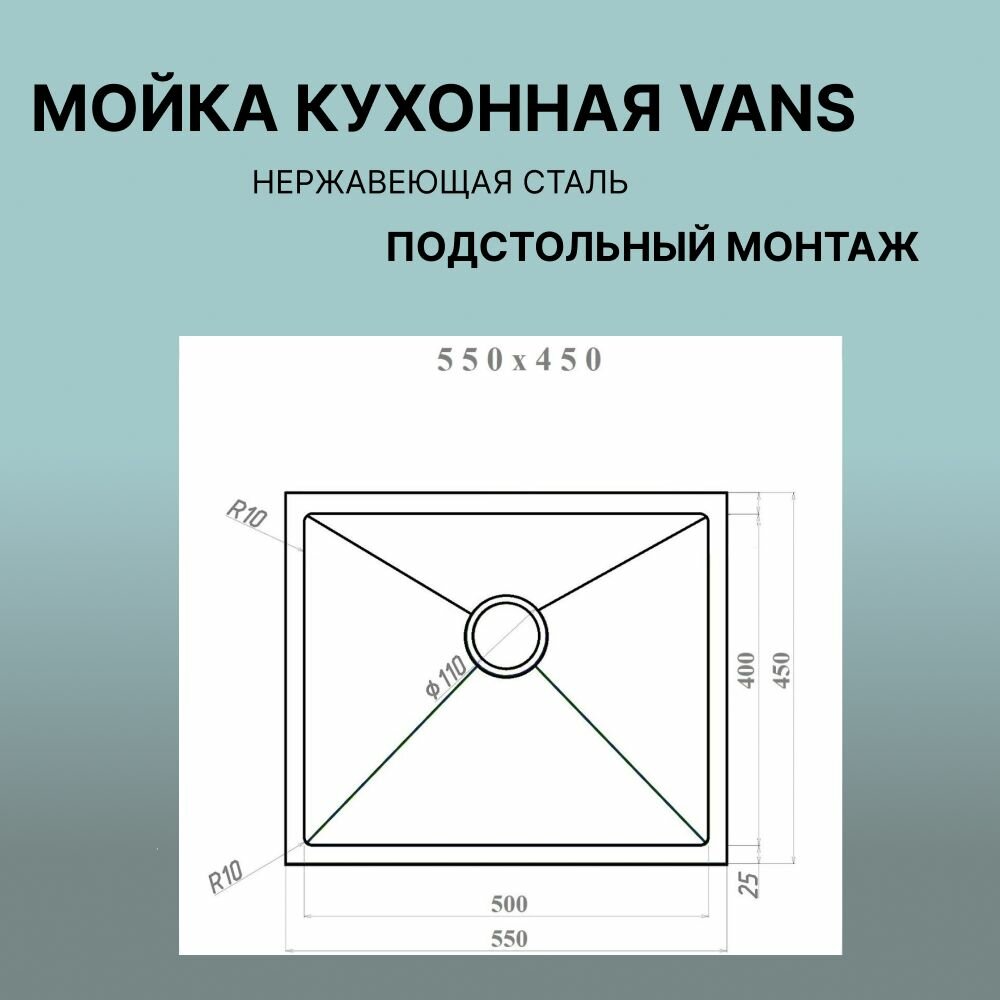 Мойка для кухни нержавеющая подстольного монтажа VANS UTM 55*45 см, цвет Satin/ Нержавеющая сталь