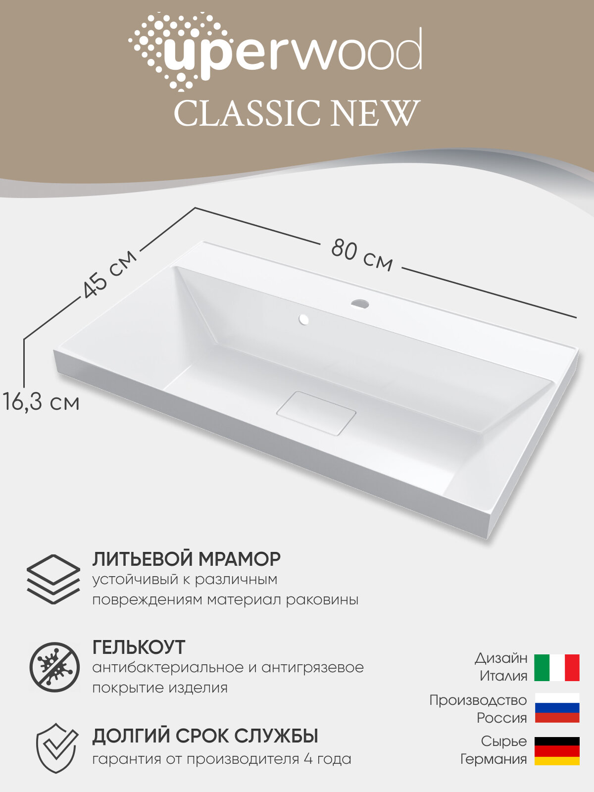 Раковина для ванной 80 см, Uperwood Classic New, белая глянцевая, с накладкой для слива интересное: