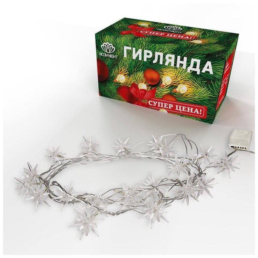 Светодиодная гирлянда NEON-NIGHT "Снежинки" 2.8 м, 8 режимов, 20 белых светодиодов, прозрачный провод