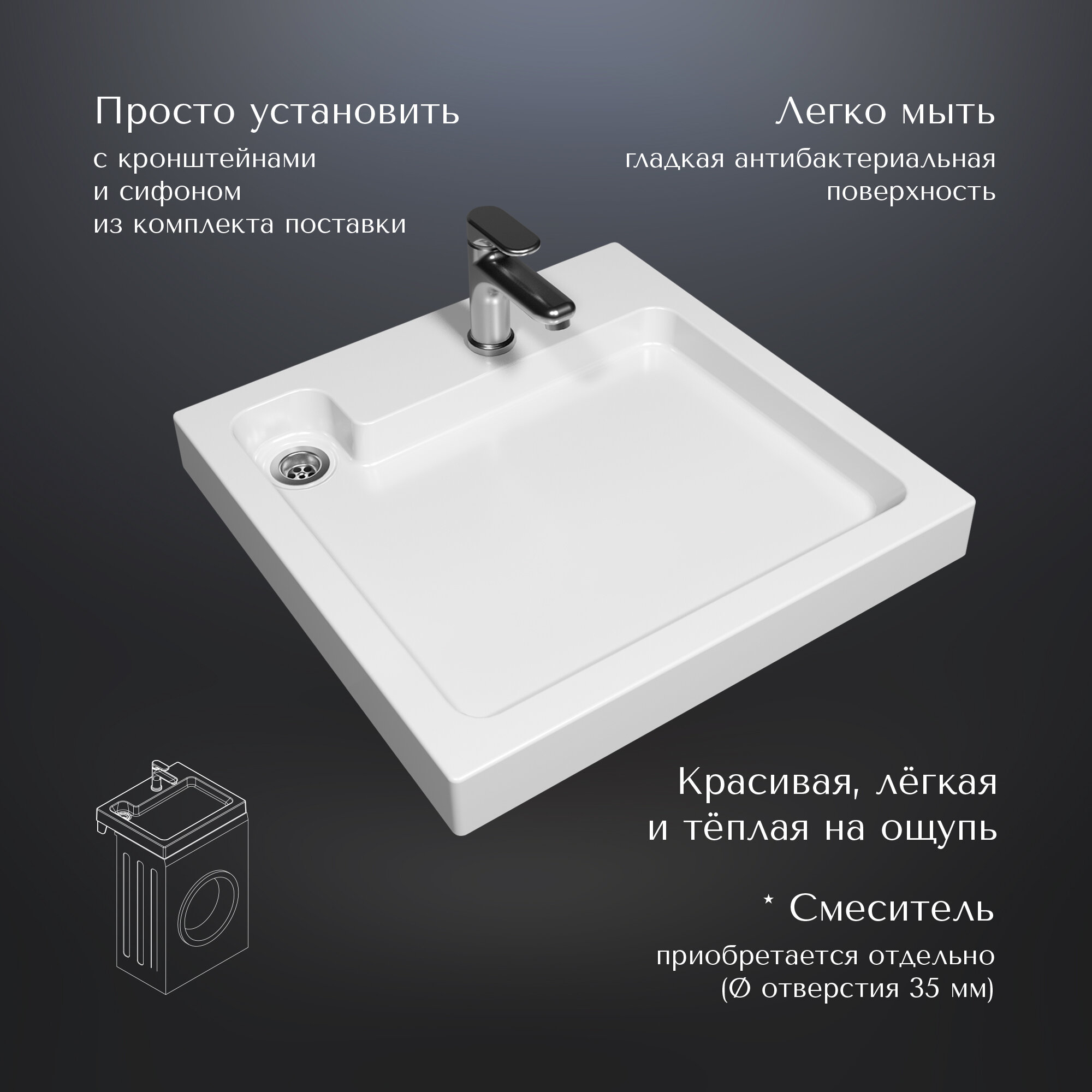 Раковина над стиральной машиной 60x60 акриловая (сифон в комплекте) LESAN интересное: