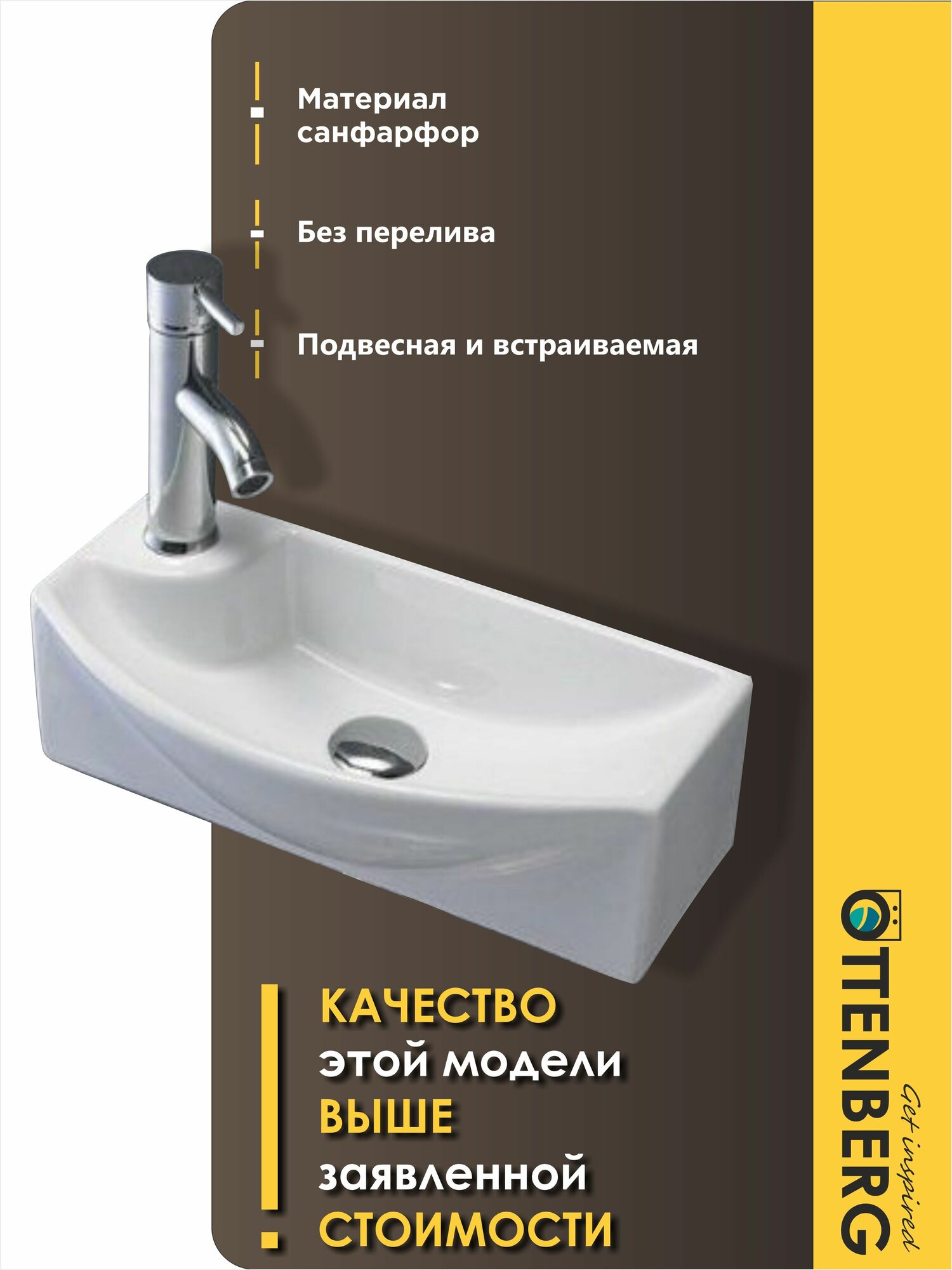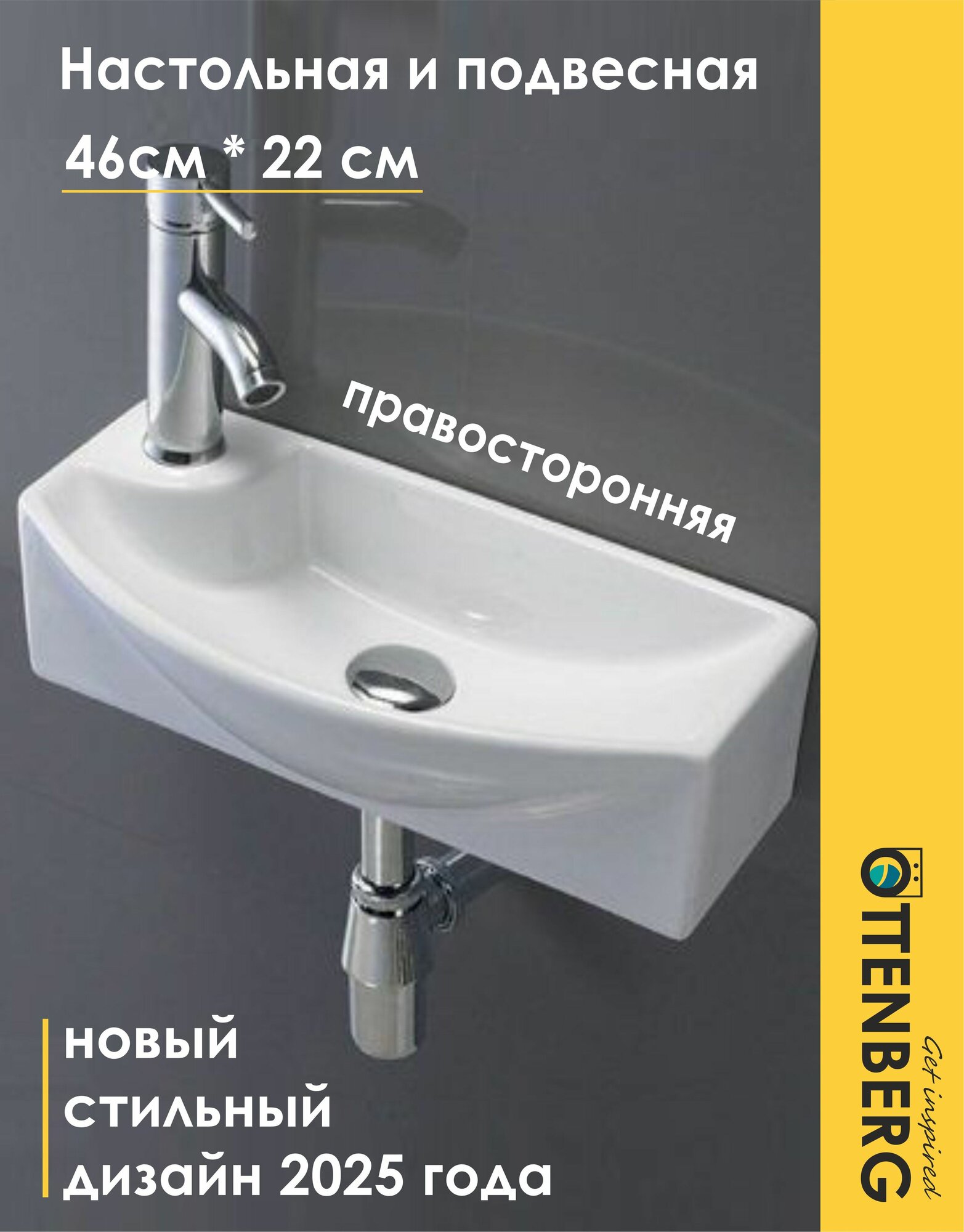 Подвесная мини раковина для туалета правосторонняя белая прямоугольная Ottenberg, 46х22х13см интересное: