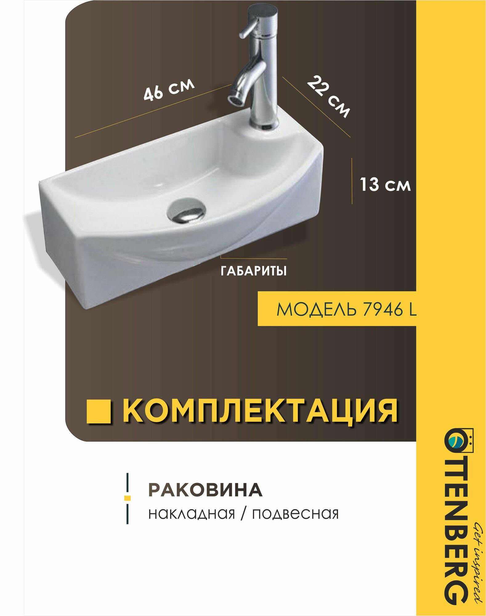 Подвесная мини раковина для туалета левосторонняя белая прямоугольная Ottenberg, 46х22х13см интересное: