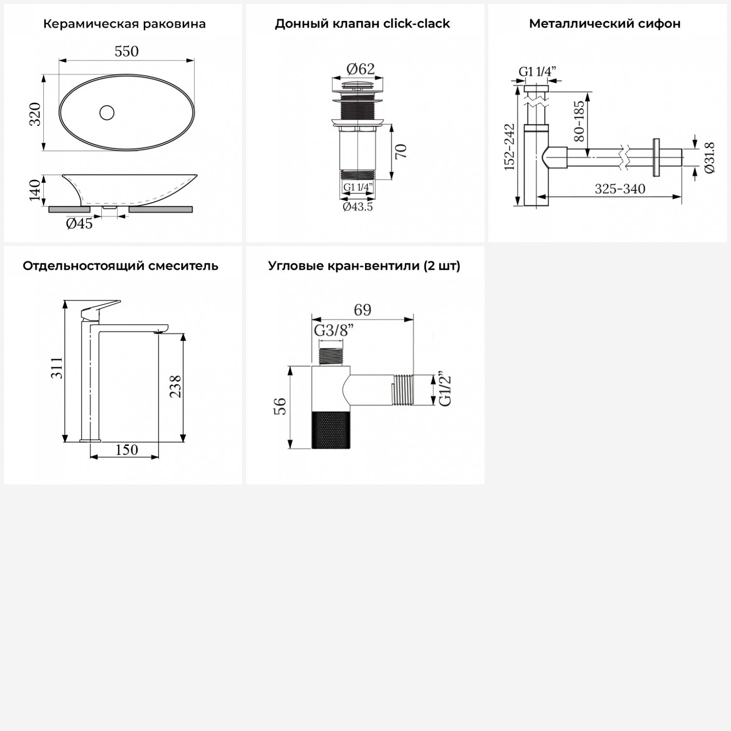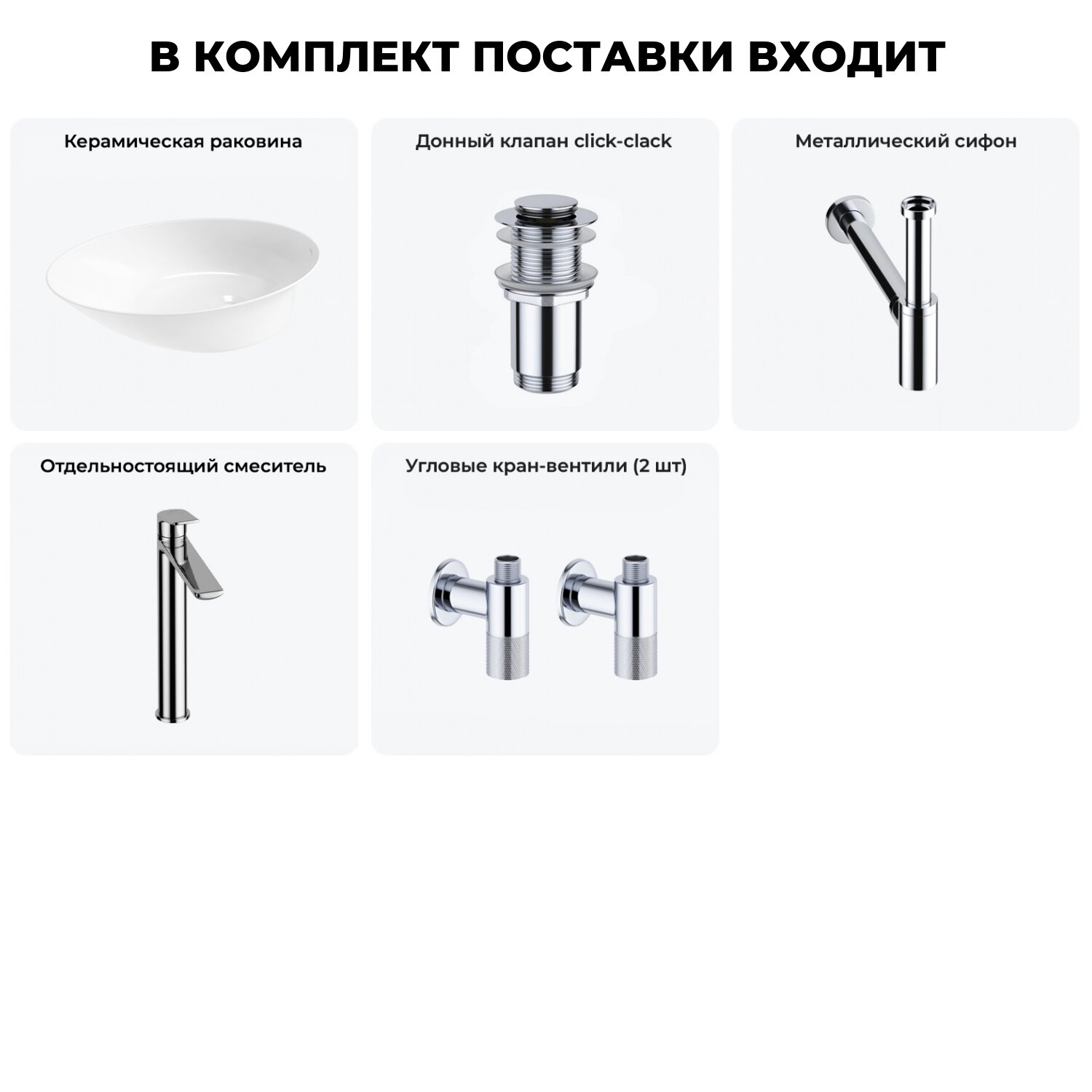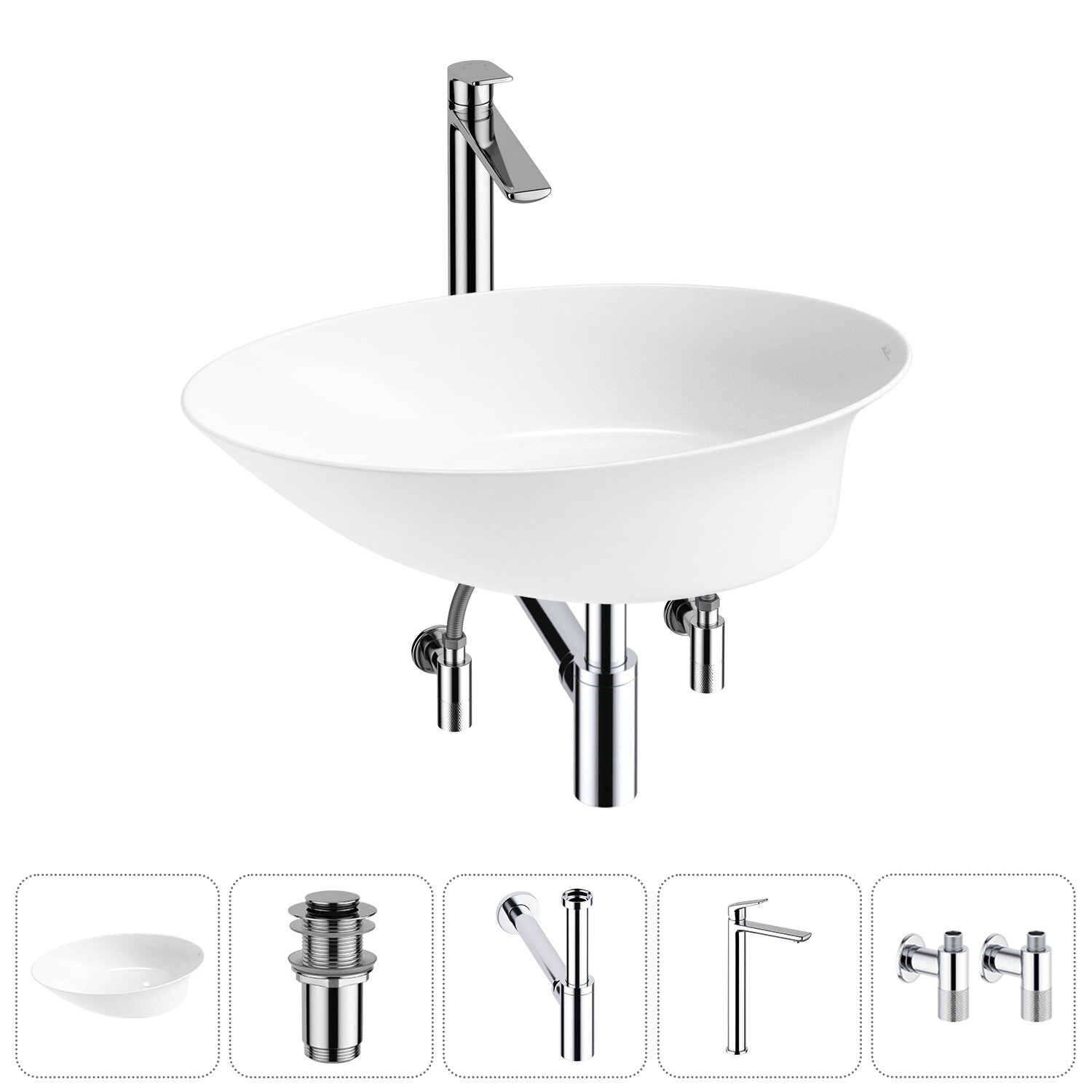 Купить Накладная раковина в ванную комнату Wellsee Faze Moment 20214971R в наборе 5 в 1: раковина 55 см в цвете белый глянец, донный клапан, сифон, смеситель, вентили (цвет набора хром)