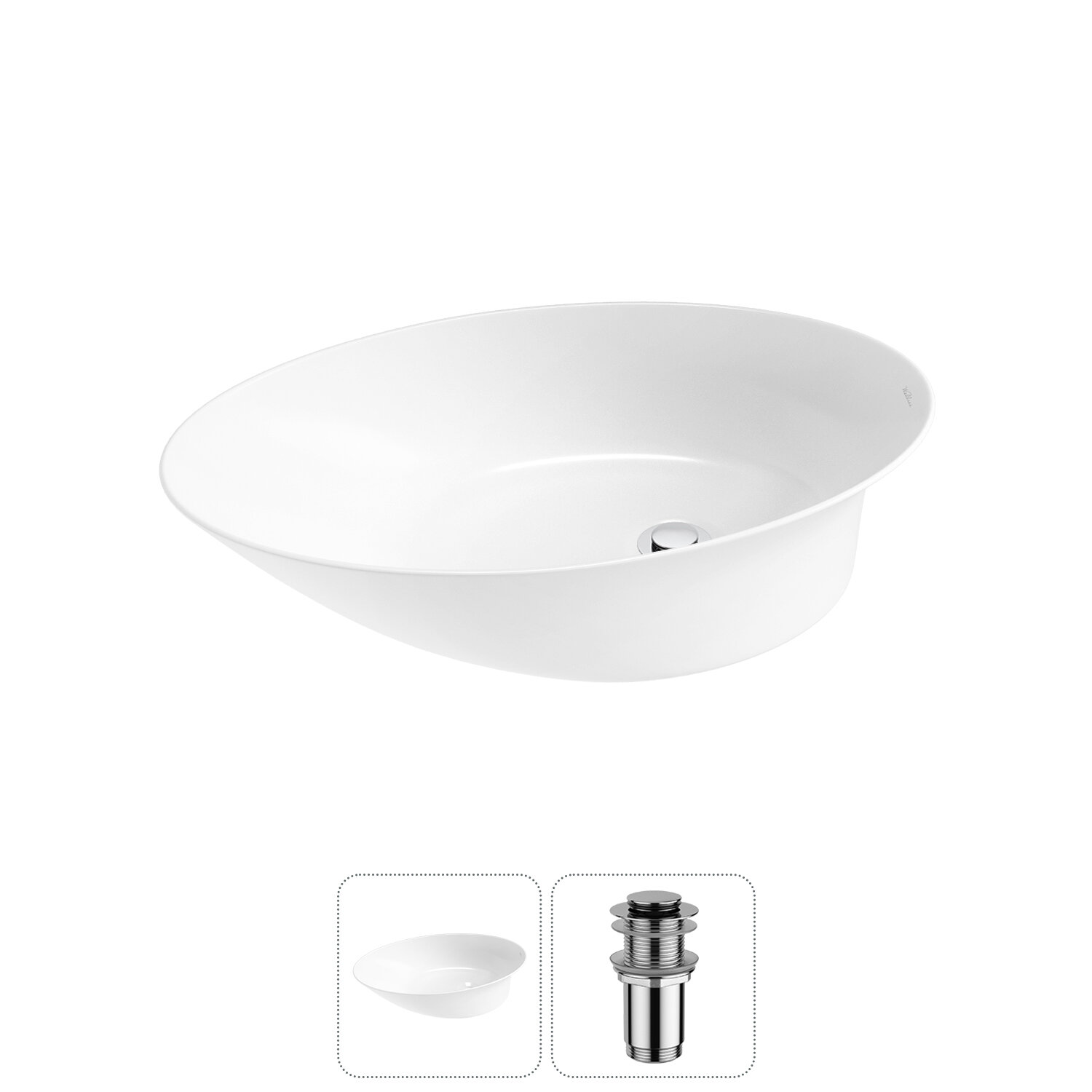 Накладная раковина в ванную комнату Wellsee Faze Moment 20214963R в наборе 3 в 1: раковина 55 см в цвете белый глянец, донный клапан, сифон (цвет набора хром)