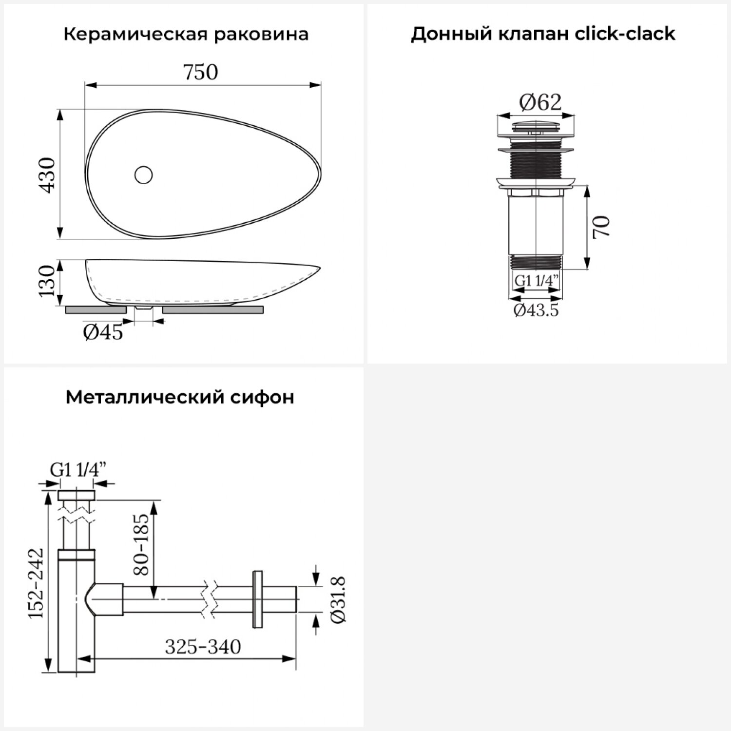 СохранитьНакладная раковина в ванную комнату Wellsee Faze Moment 20212161R в наборе 3 в 1: раковина 76 см в цвете белый глянец, донный клапан, сифон (цвет набора хром) интересное: