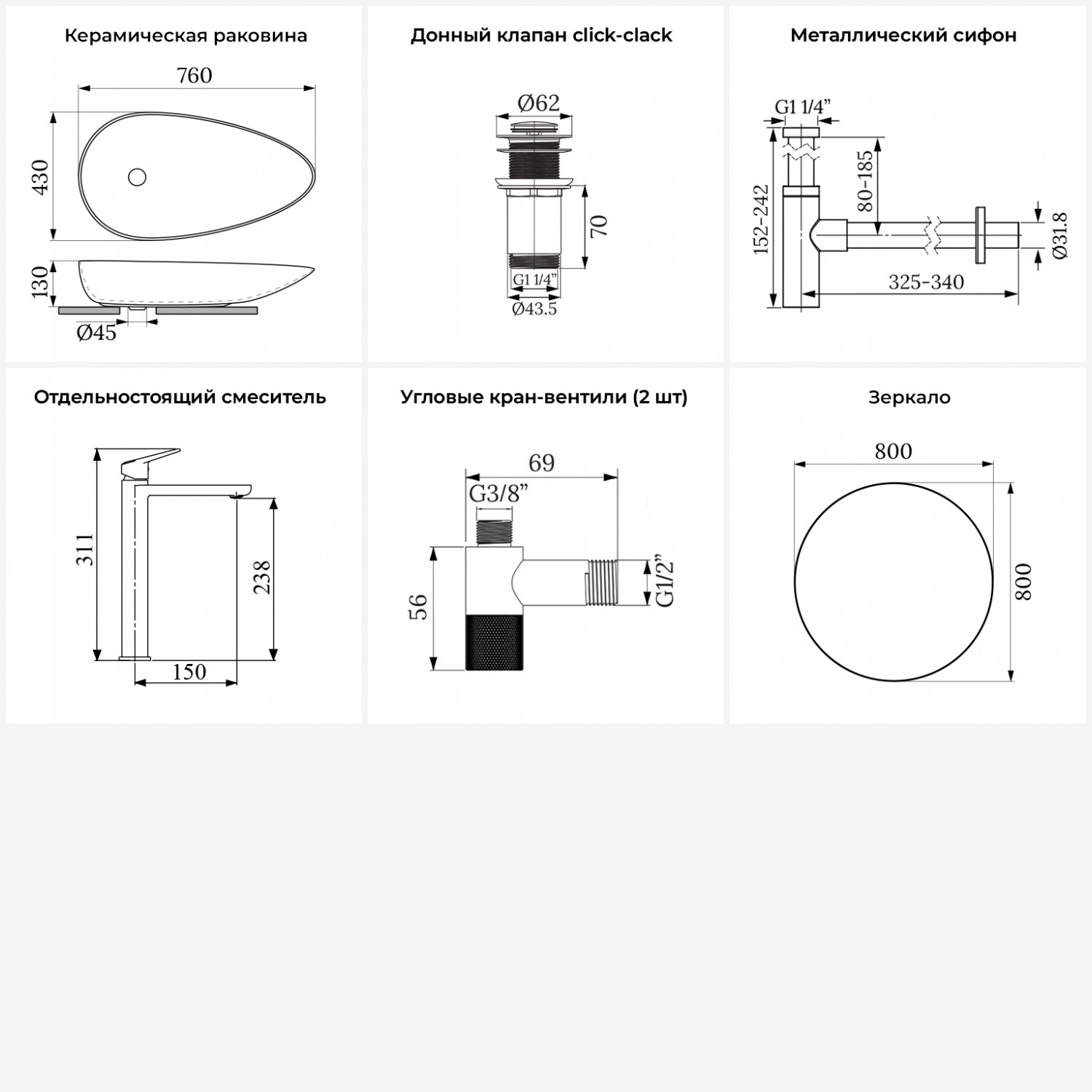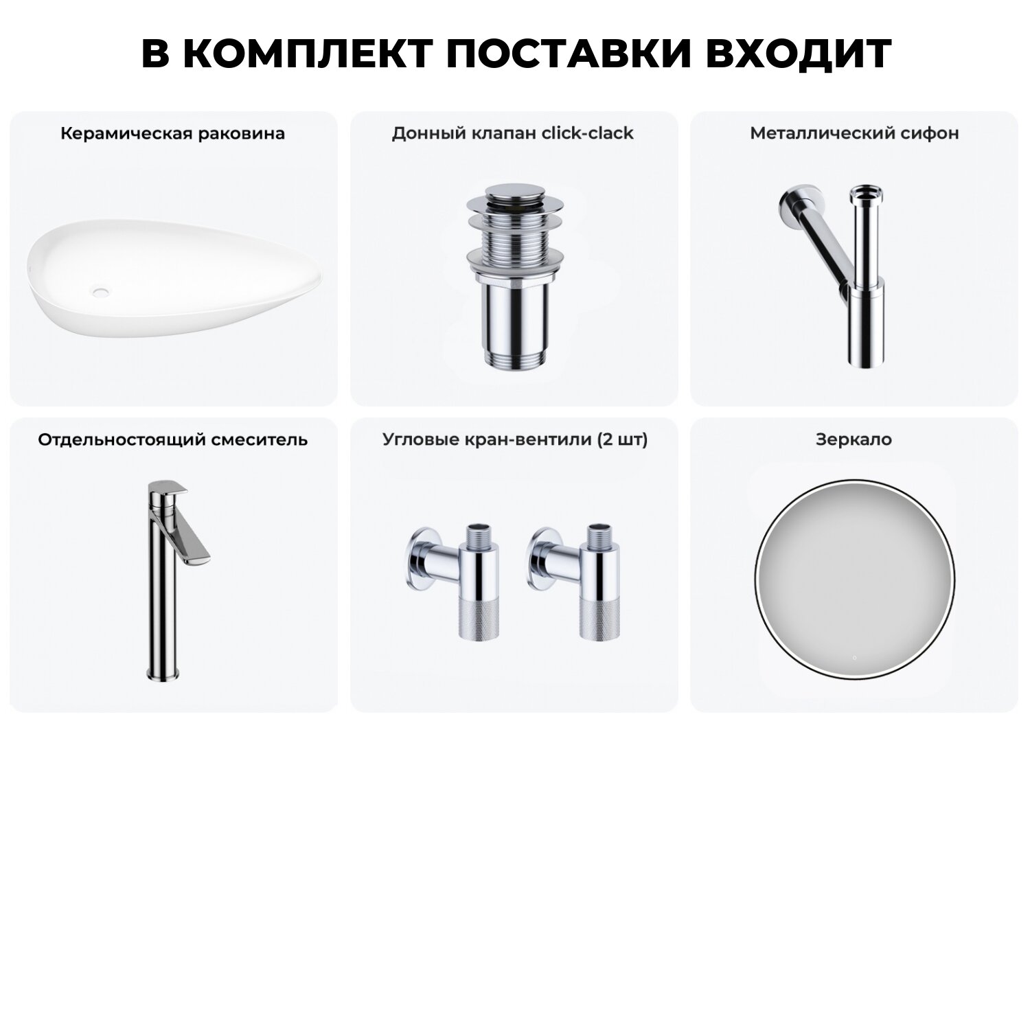 СохранитьНакладная раковина в ванную комнату Wellsee Faze Moment 20218907R в наборе 6 в 1: раковина 76 см в цвете белый глянец, донный клапан, сифон, смеситель, вентили, зеркало (цвет набора хром) интересное: