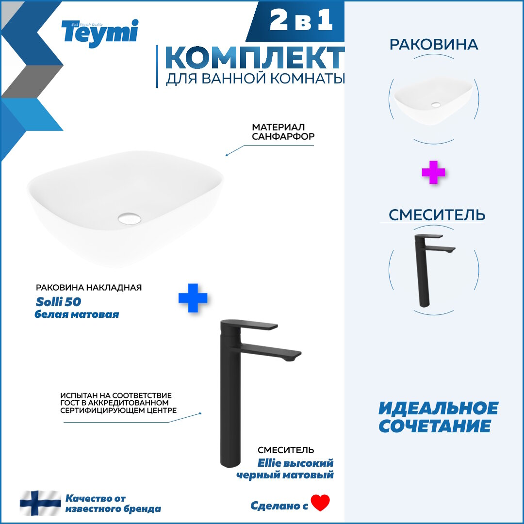 Купить Раковина для ванной накладная Teymi Solli 50 белая матовая в комплекте смеситель высокий черный матовый F12905