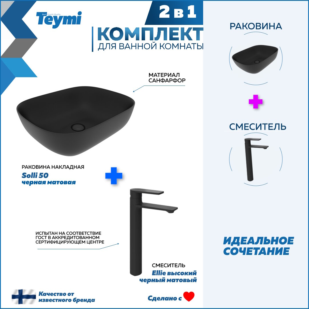 Купить Раковина для ванной накладная Teymi Solli 50 черная матовая в комплекте смеситель высокий черный матовый F12906