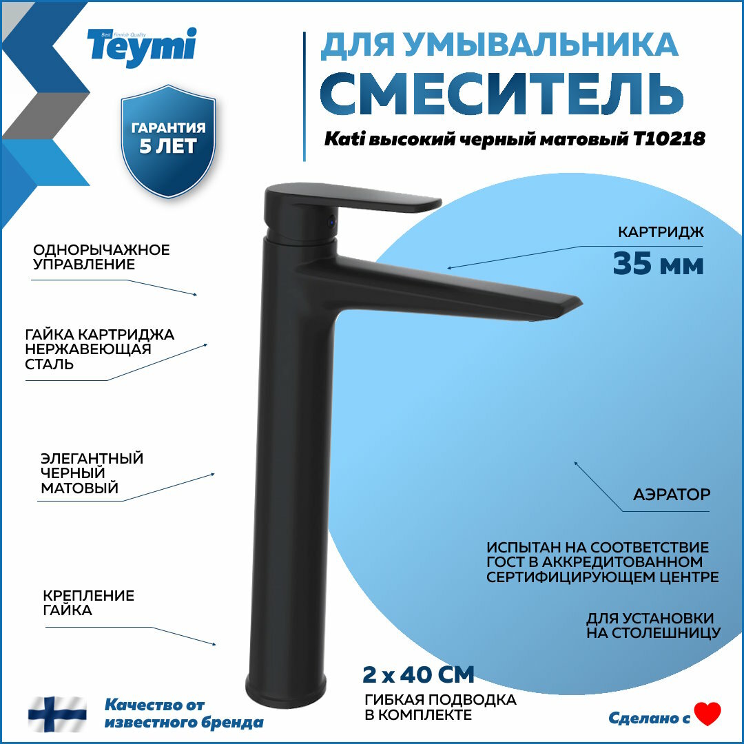 Раковина для ванной накладная Teymi Lori 40 черная матовая в комплекте смеситель высокий черный матовый F12994