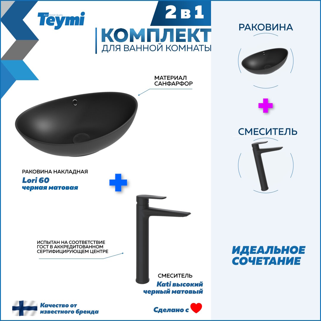 Купить Раковина для ванной накладная Teymi Lori 60 черная матовая в комплекте смеситель высокий черный матовый F12999
